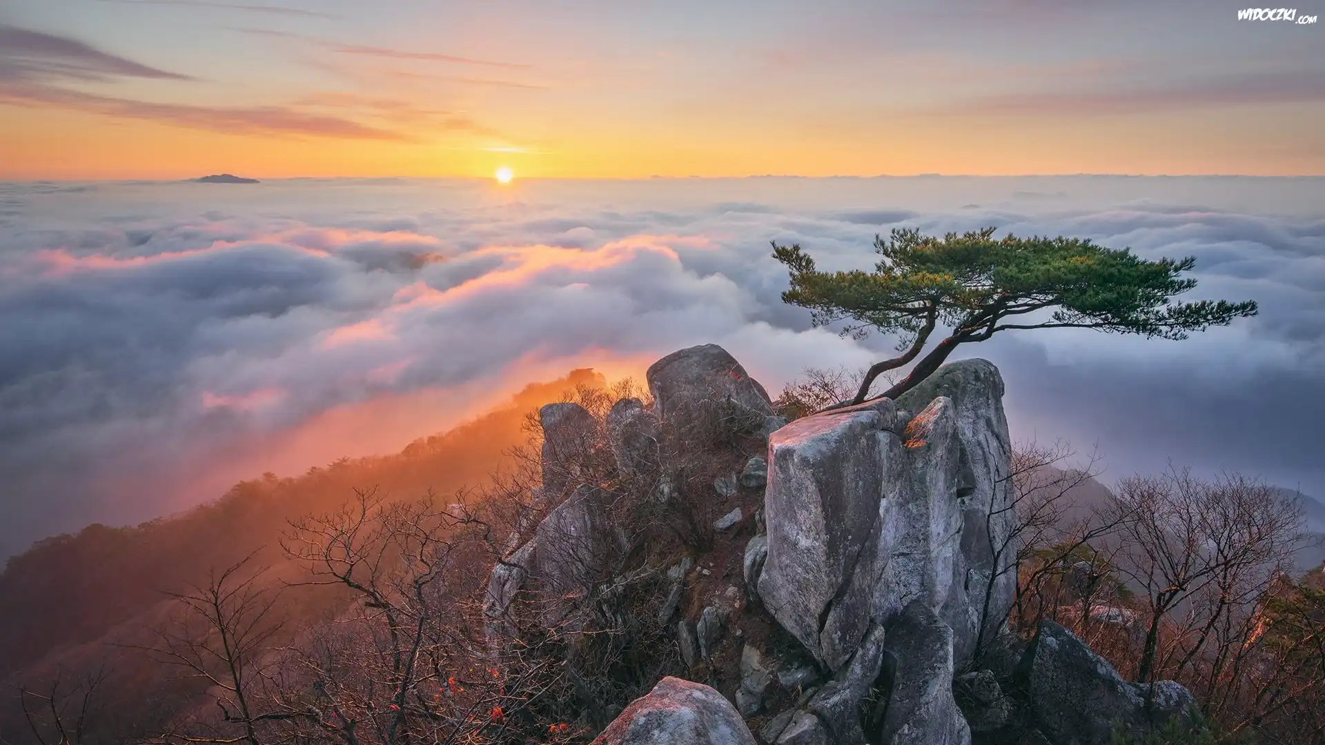 Zdjęcia, Wschód słońca, Góry, Mgła, Chmury, Rośliny, Drzewo, Sosna, Skały