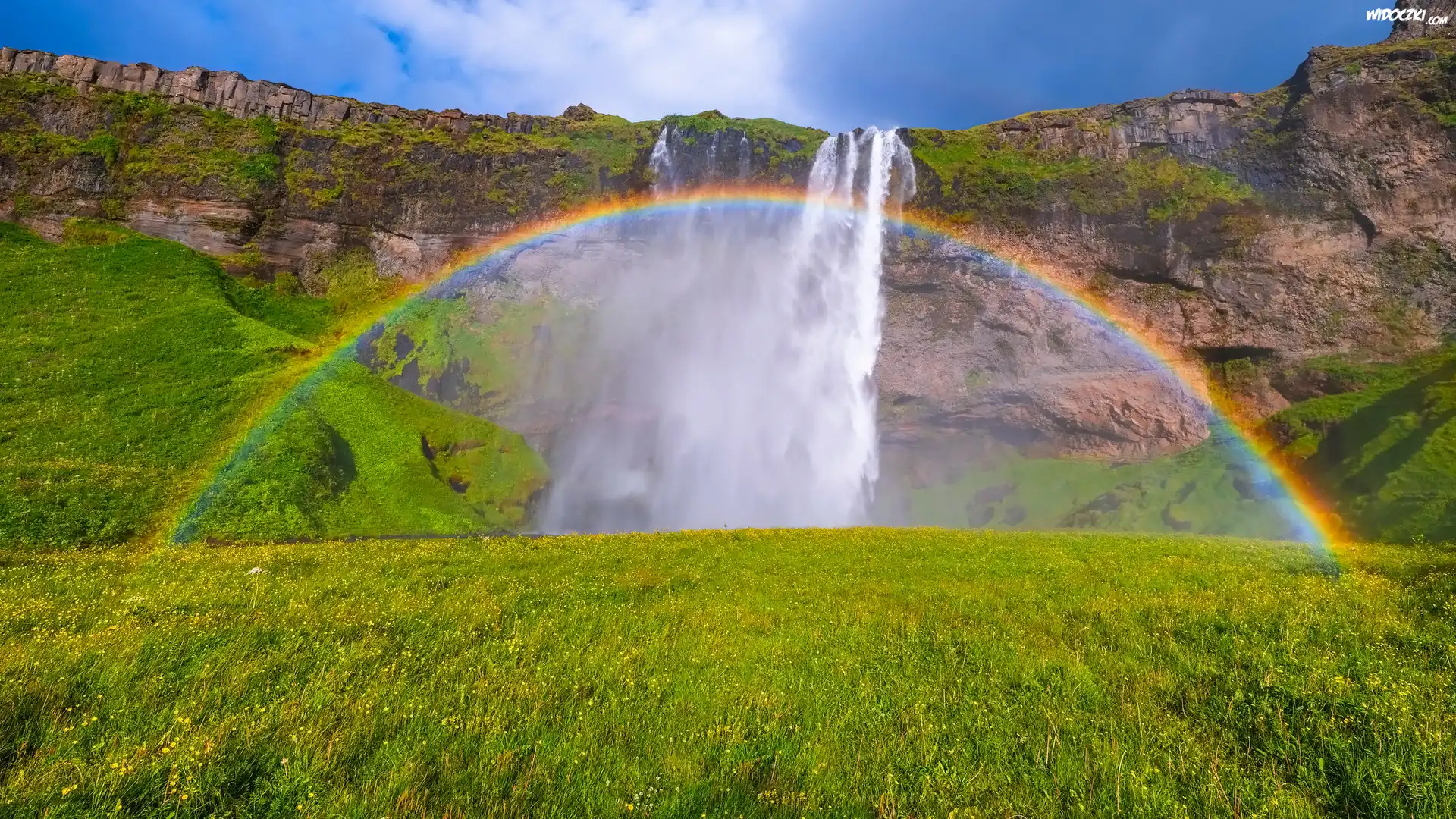Zdjęcia, Wodospad, Seljalandsfoss, Trawa, Skały, Tęcza, Islandia