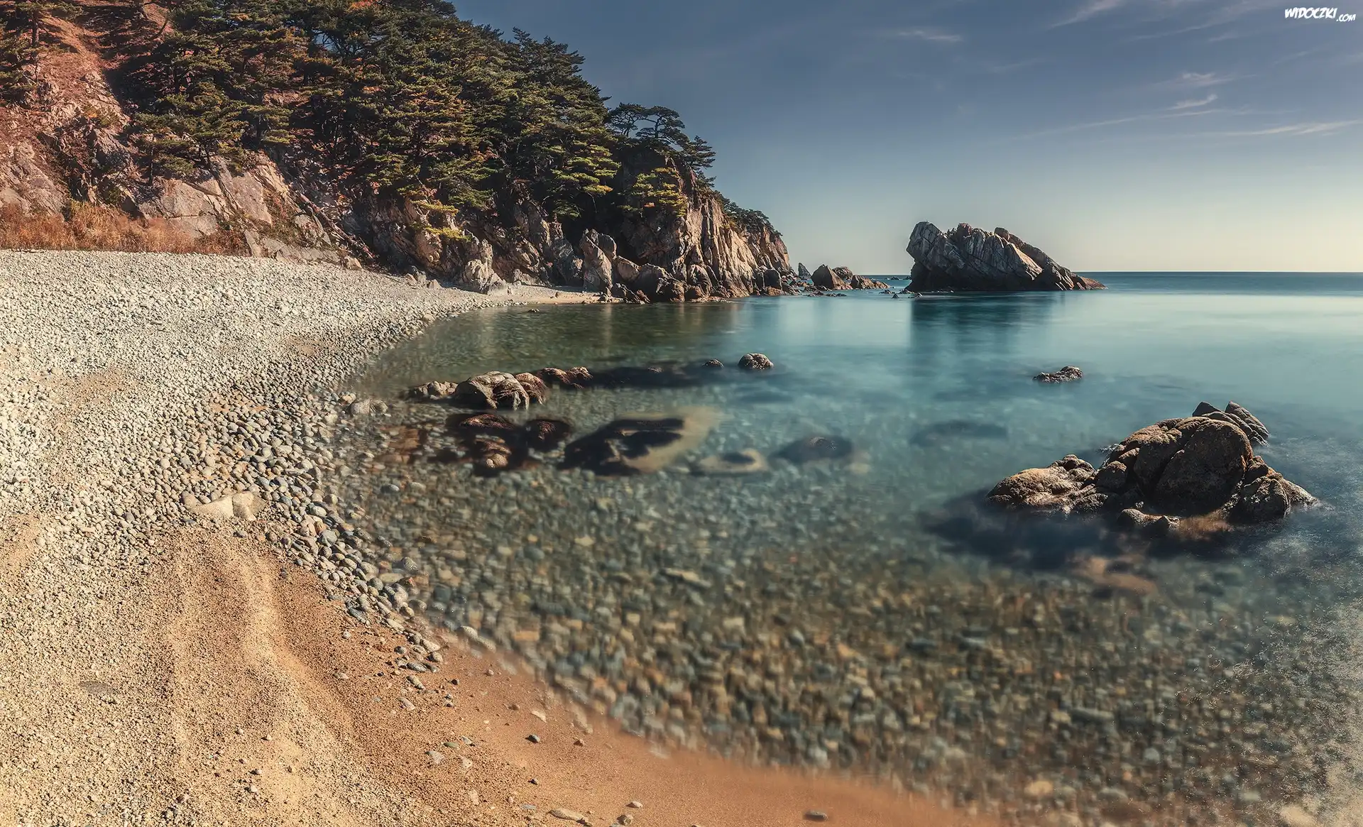 Morze Japońskie, Skały, Drzewa, Kamienie, Piasek, Zatoka Telyakovskogo, Kraj Nadmorski, Rosja