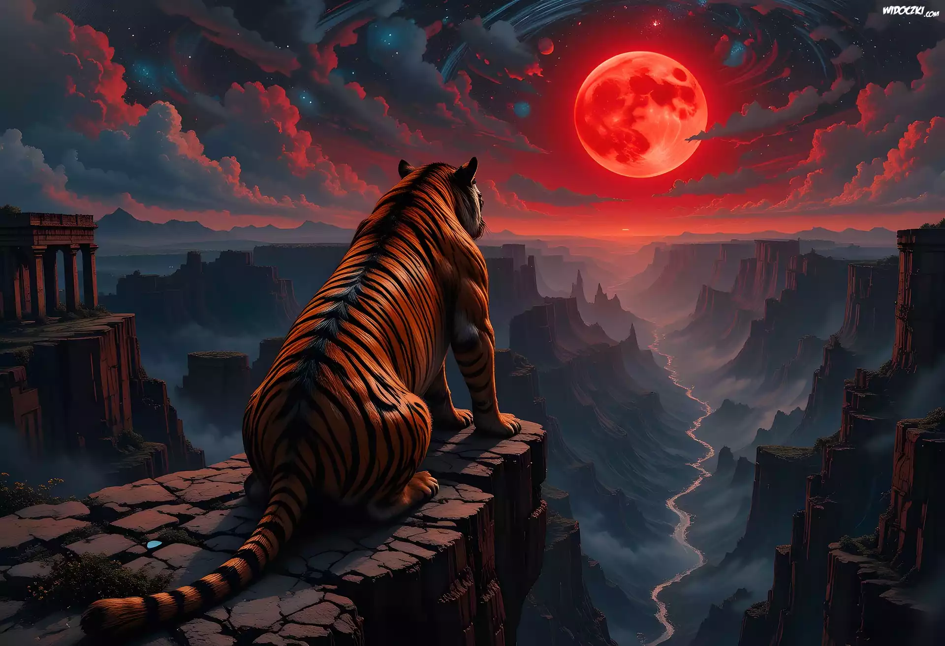 Grafika, Góry, Kanion, Skały, Tygrys, Noc, Księżyc