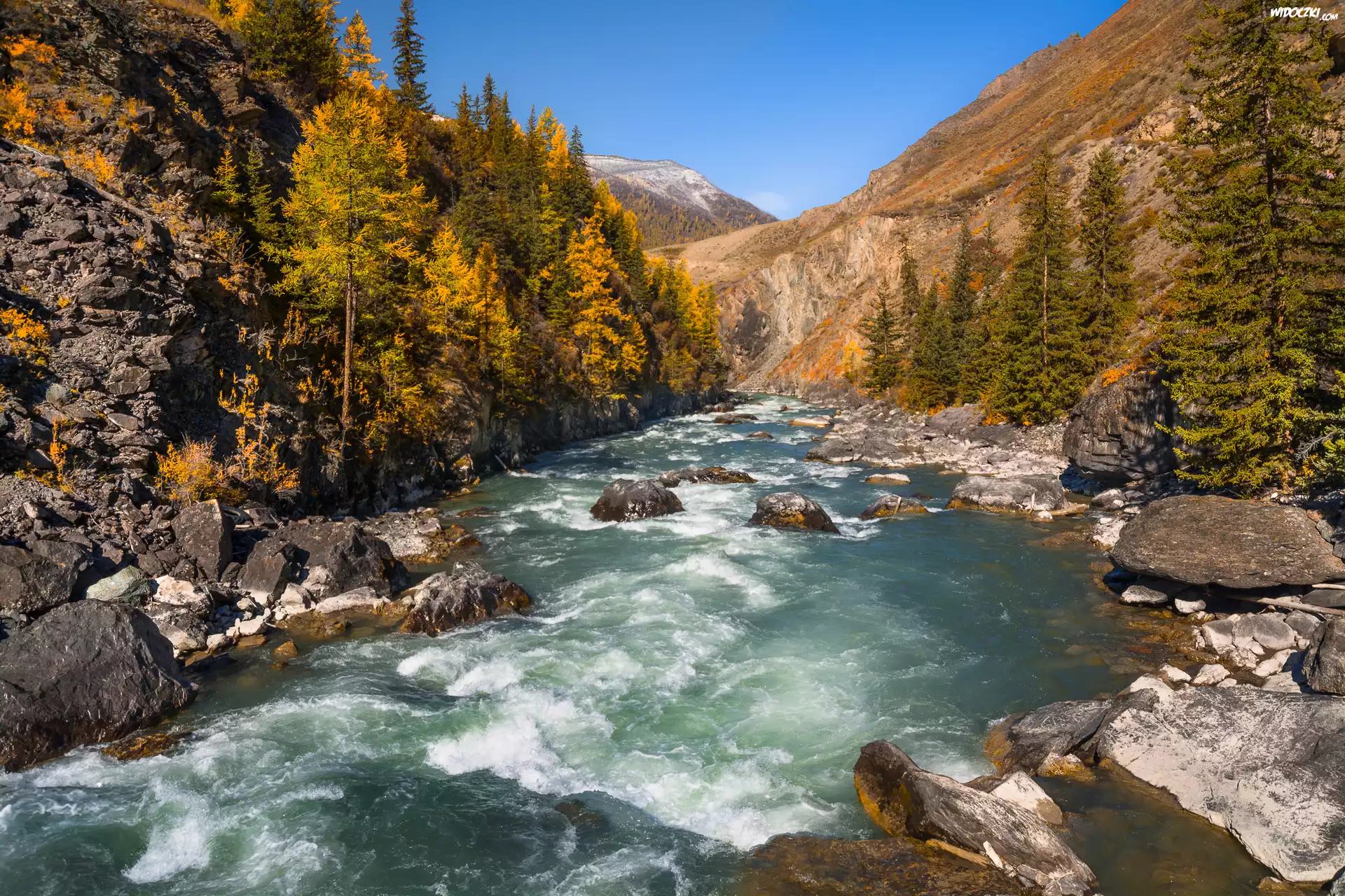 Rosja, Góry, Ałtaj, Rzeka Czuja, Kamienie, Skały, Las, Pożółkłe, Drzewa, Jesień