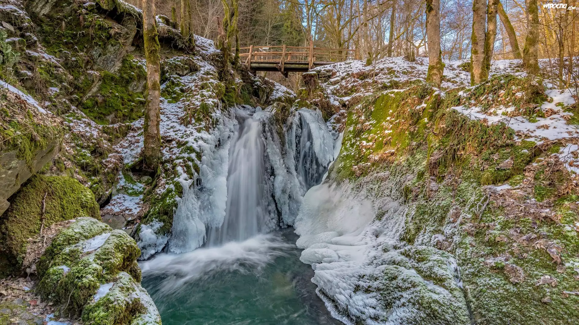 Zdjęcia, Las, Skały, Wodospad, Śnieg, Lód, Most, Rzeka