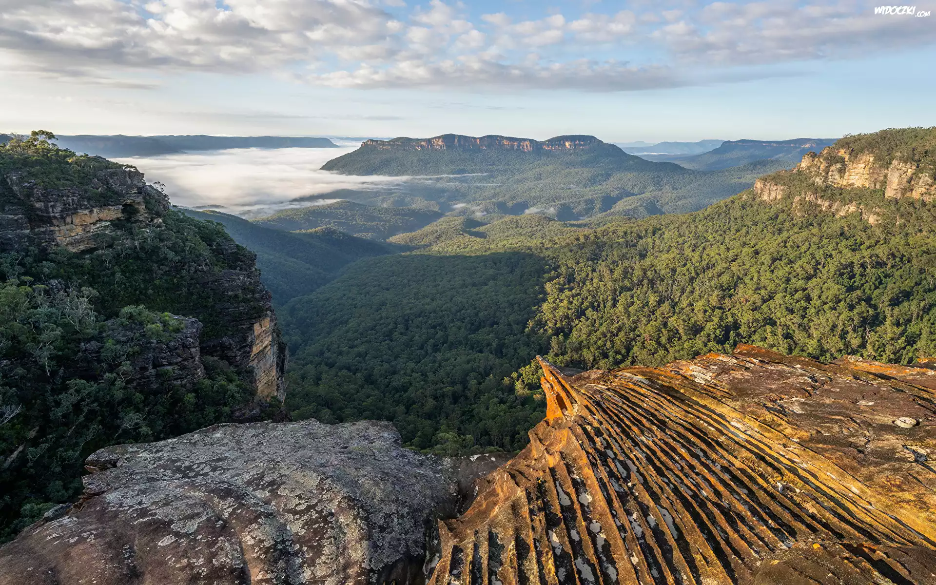 Australia, Nowa Południowa Walia, Dolina, Jamison Valley, Tarpeian Rock, Góry Błękitne, Skały, Lasy, Mgła, Poranek |