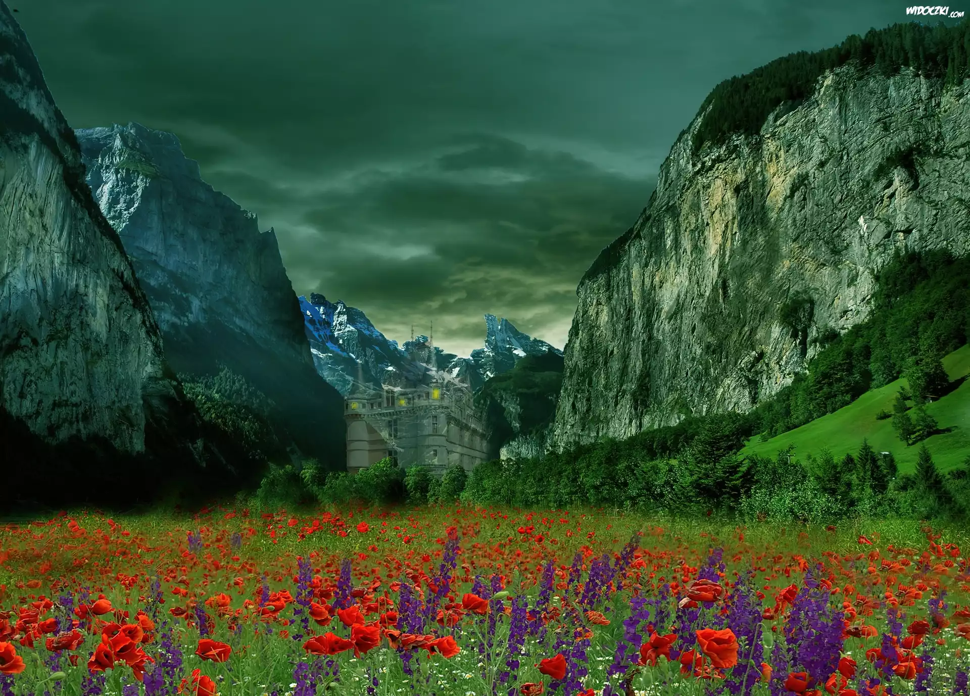 Zdjęcia, Skały, Łąka, Maki, Zamek