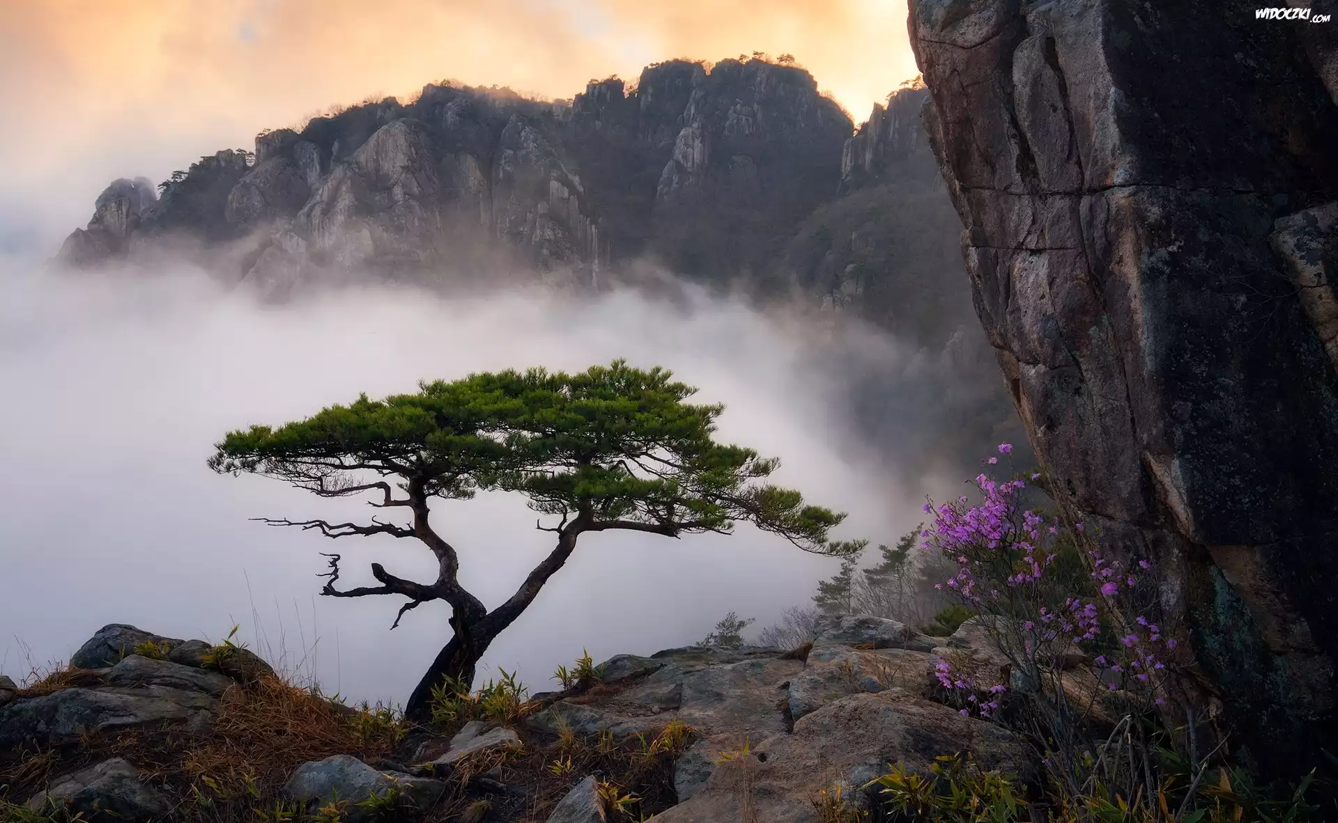 Skały, Góry, Drzewo, Sosna, Mgła, Kwiaty