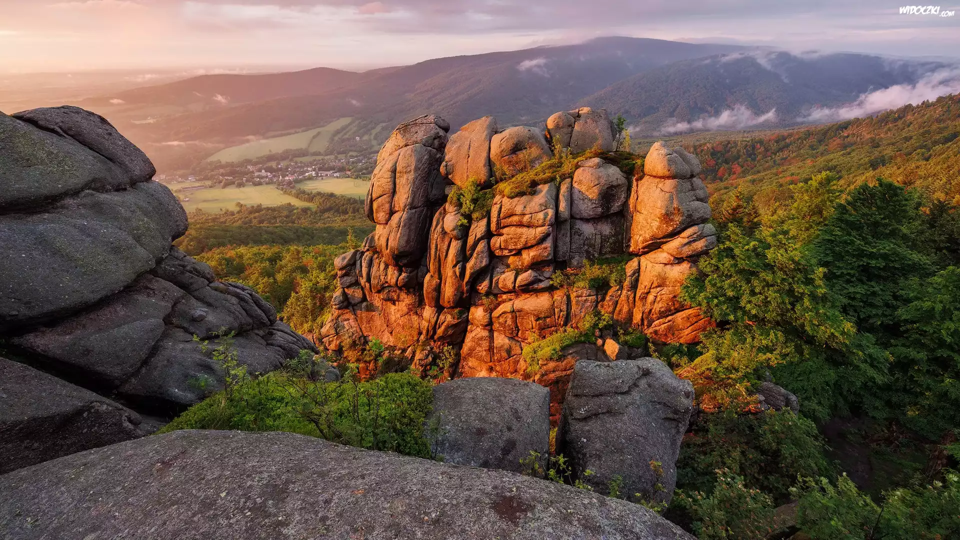 Zdjęcia, Czechy, Góry, Izerskie, Skały, Drzewa, Mgła