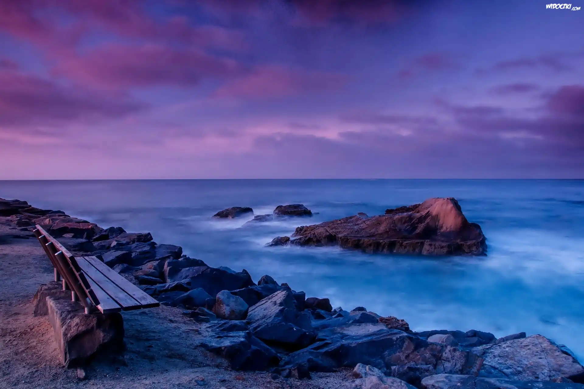 Zdjęcia, Morze, Skały, Ławka