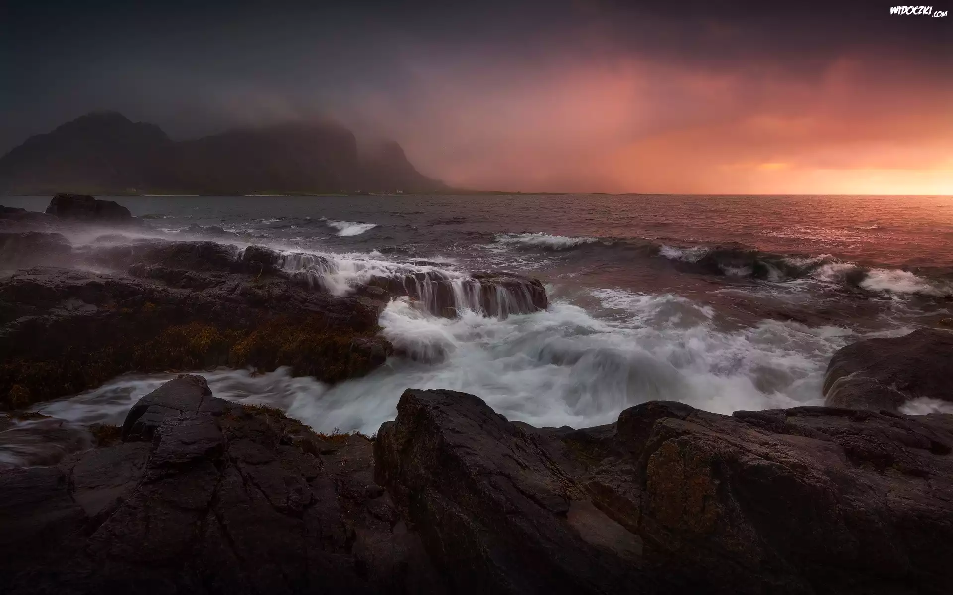 Morze, Skały, Wschód słońca, Brzeg, Fale, Góry