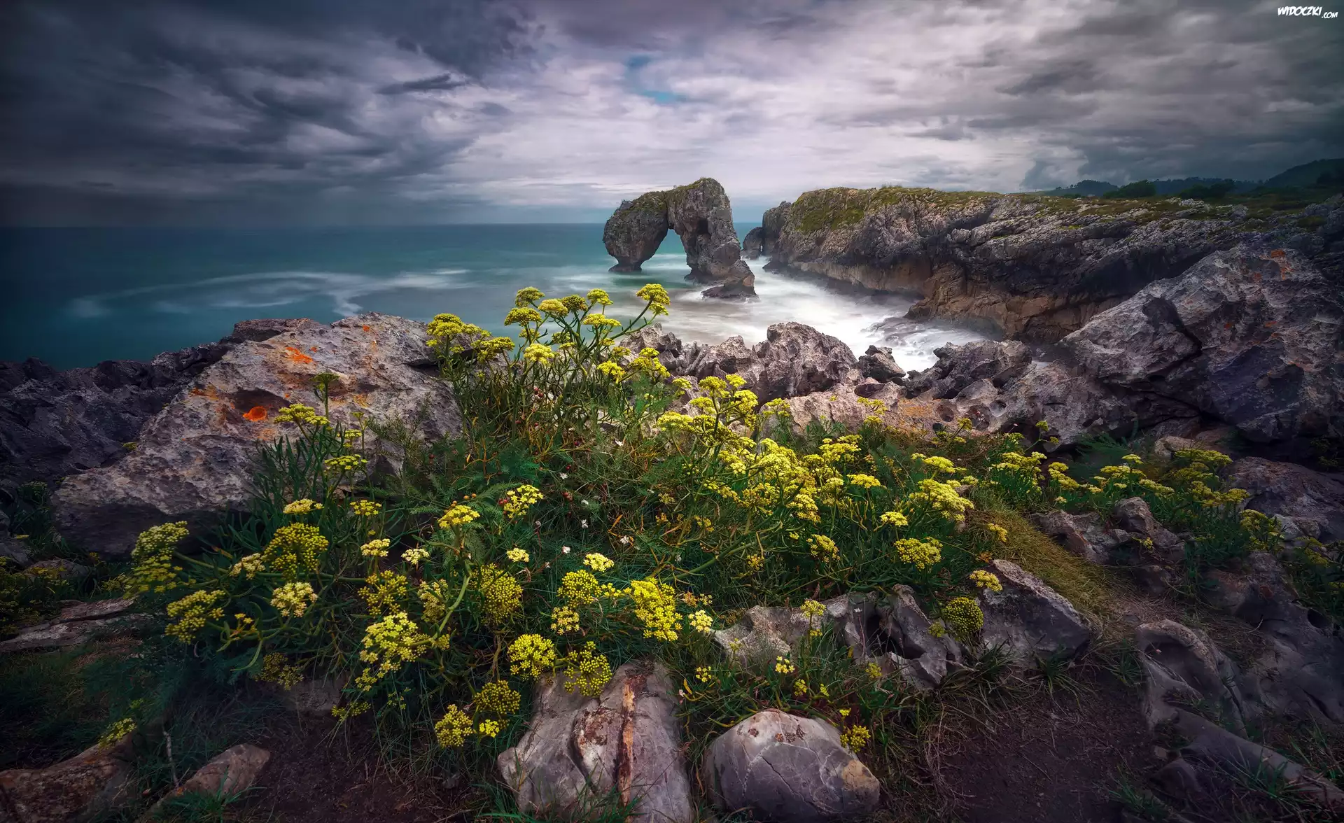 Zdjęcia, Morze, Łuk skalny, Kwiaty, Skały, Wybrzeże, Playa de La Huelga, Gmina Hontoria, Asturia, Hiszpania