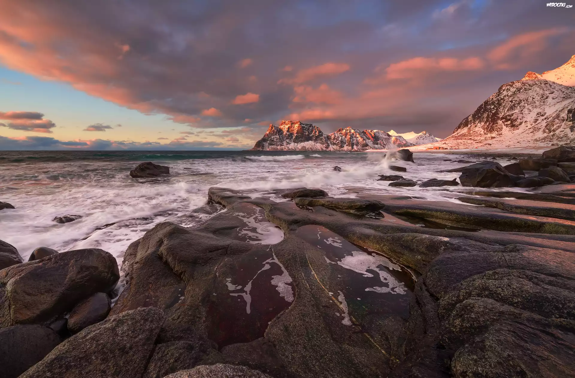 Morze, Skały, Ośnieżone, Góry, Chmury, Uttakleiv, Norwegia
