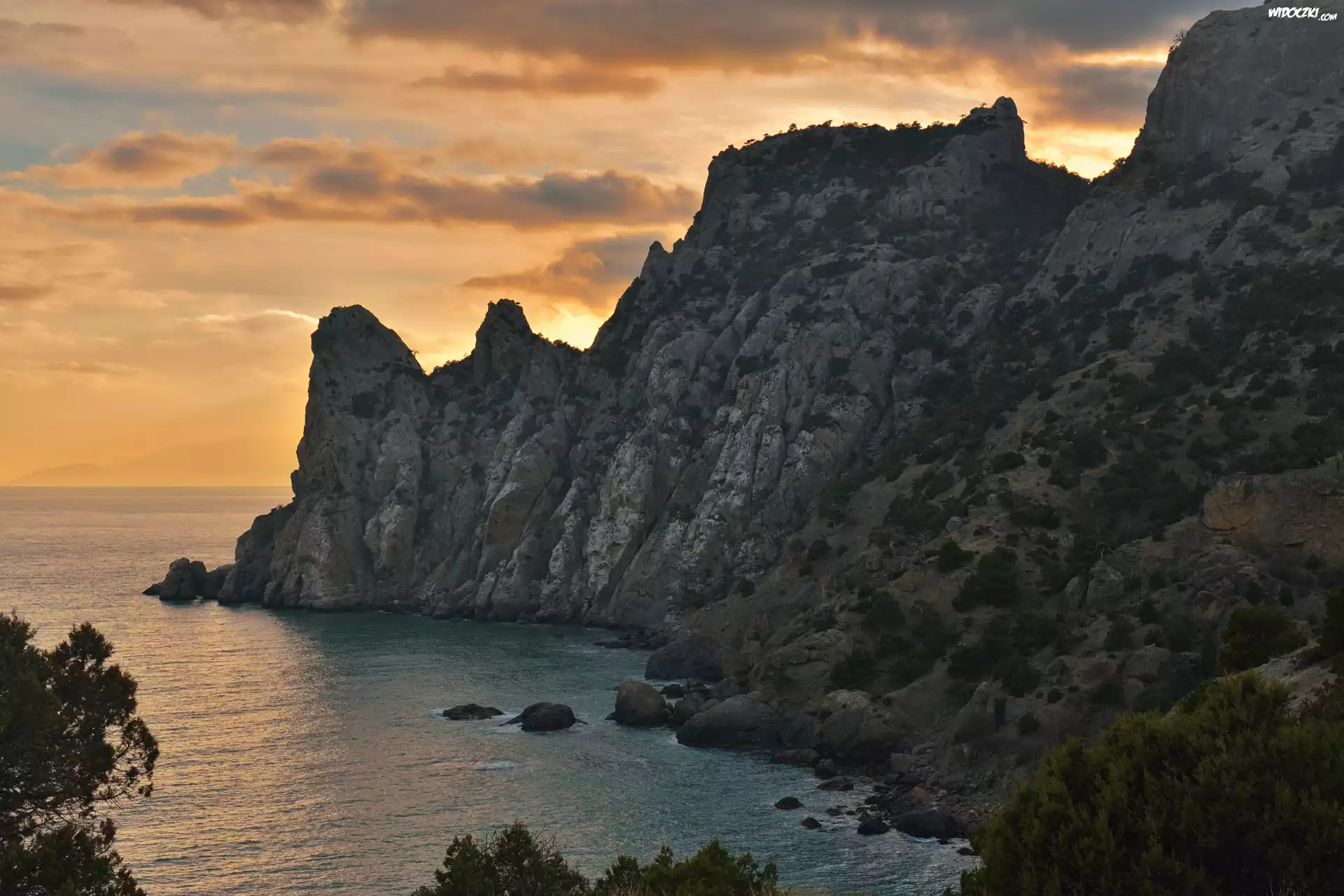 Morze, Skały, Drzewa, Roślinność, Chmury, Wschód słońca