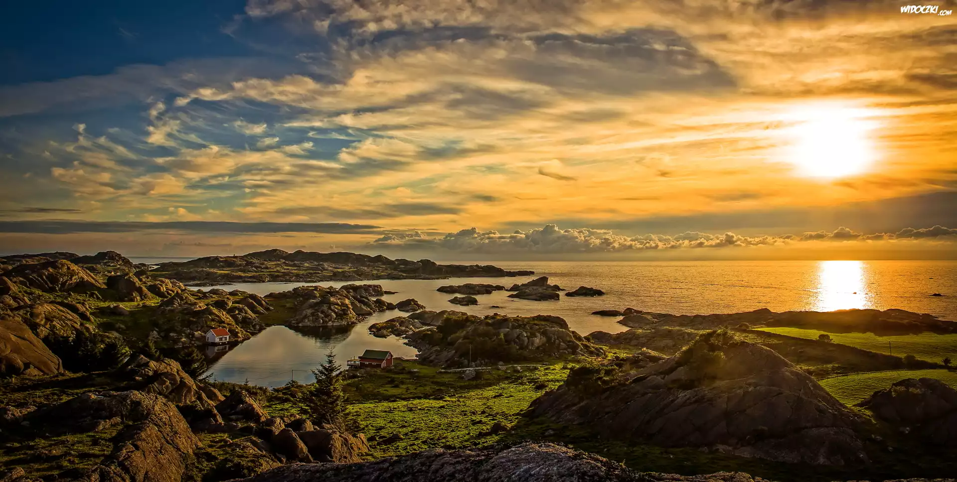 Morze, Skały, Domy, Zatoka, Chmury, Promienie, Słońca