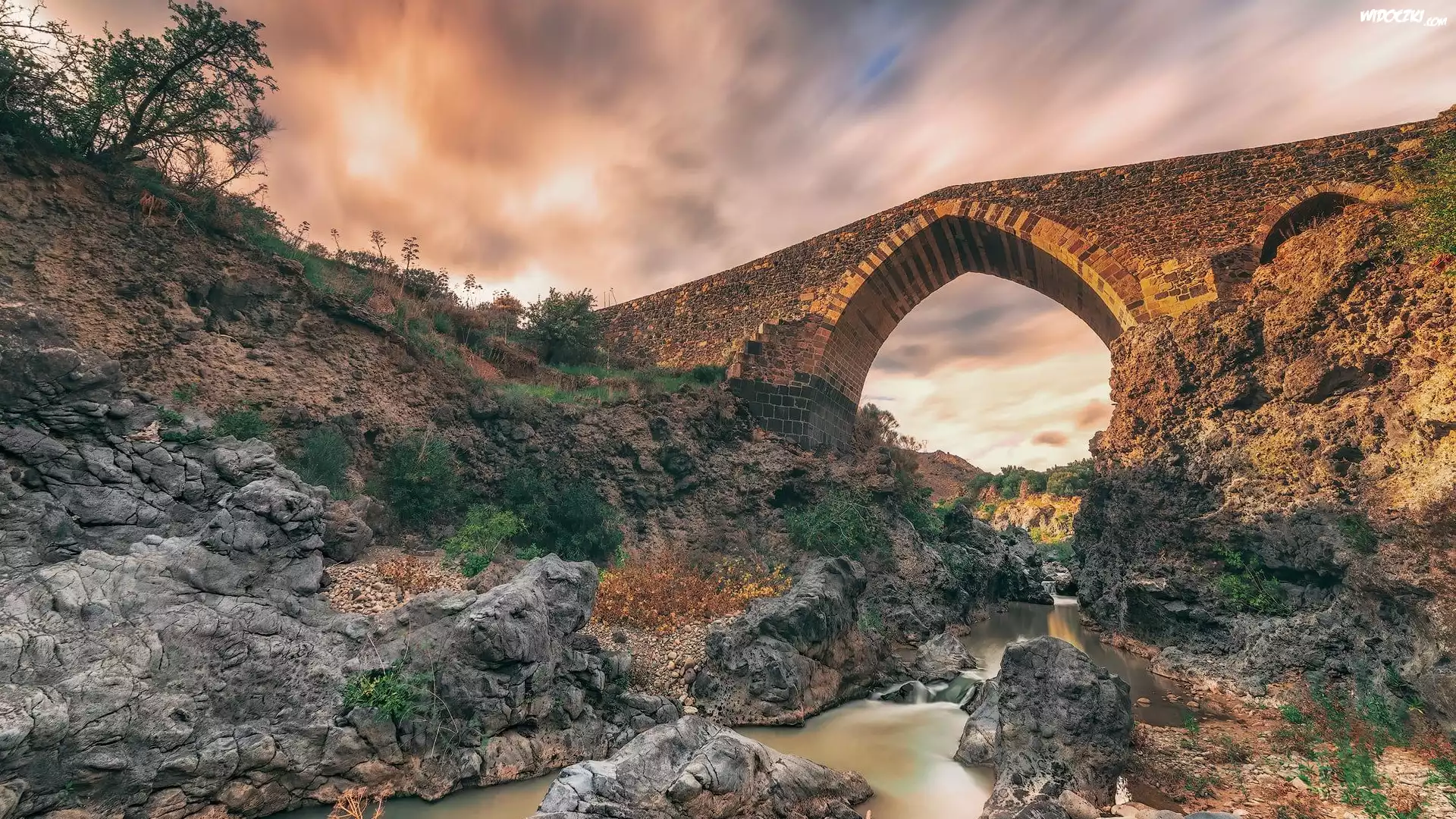 Zdjęcia, Rzeka Simeto, Skały, Kamienny, Most, Ponte dei Saraceni, Drzewa, Sycylia, Włochy