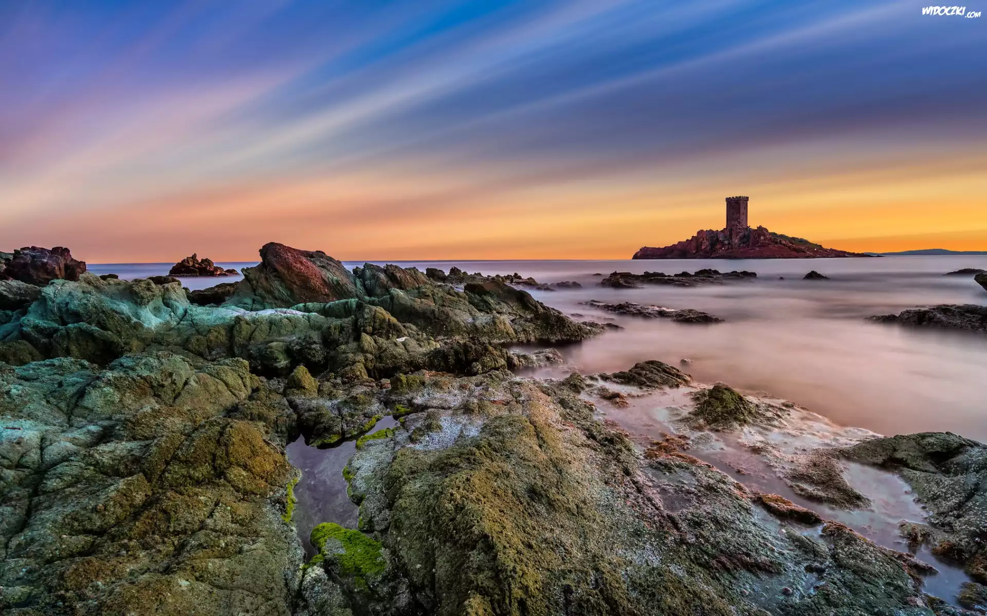 Zdjęcia, Morze, Wyspa, Omszałe, Skały, Kolorowe, Niebo