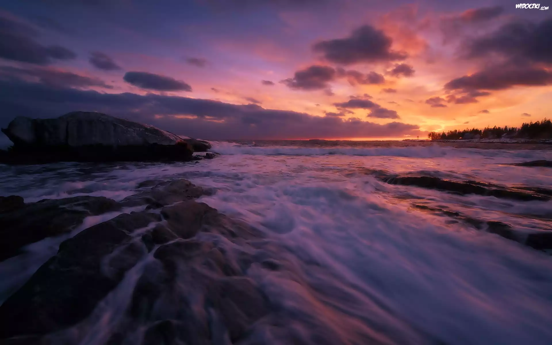 Stany Zjednoczone, Stan Maine, Ocean Atlantycki, Chmury, Zachód słońca, Skały