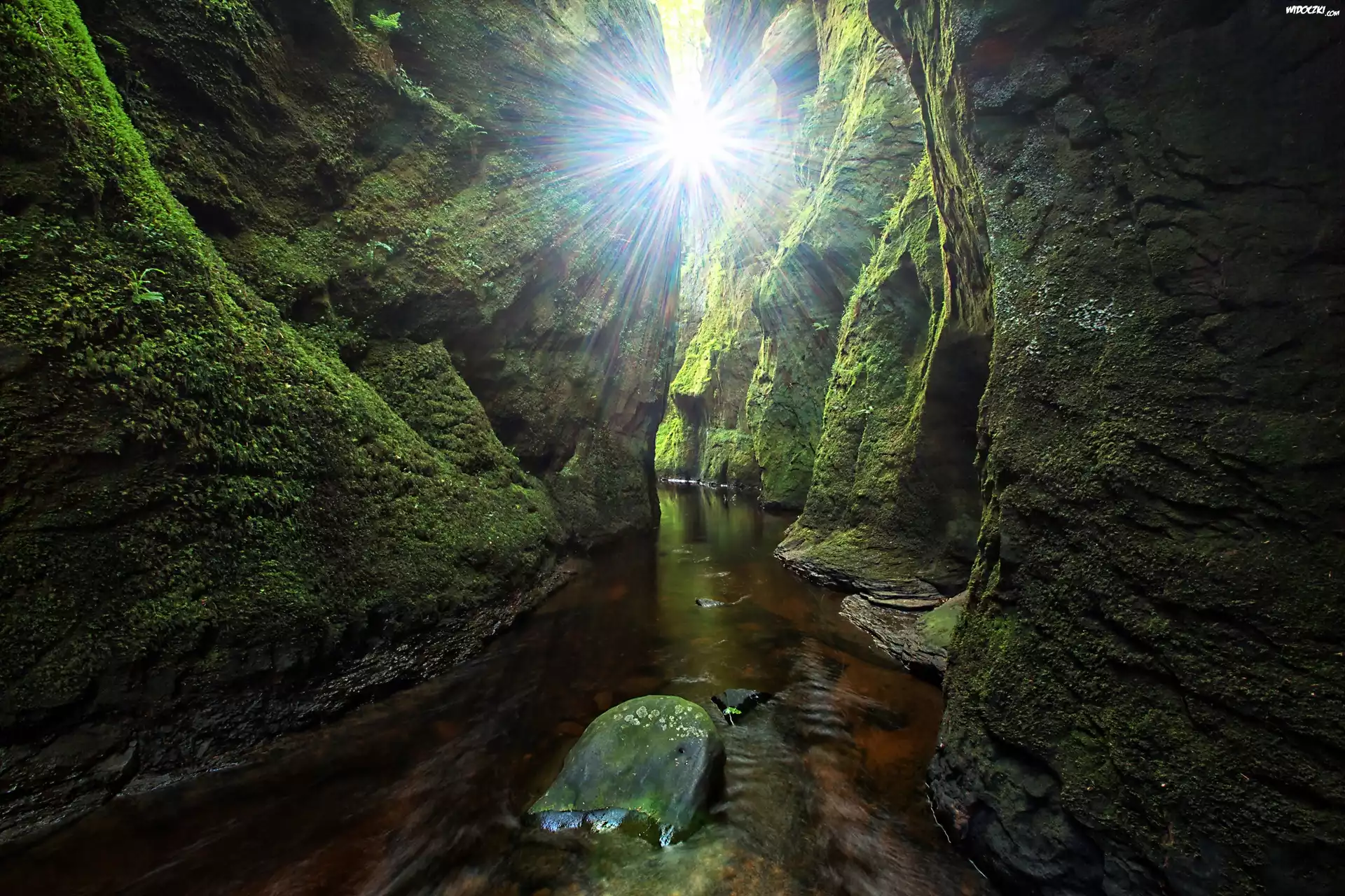 Omszałe, Skały, Jaskinia, Rzeka, Promienie, Słońca, Szkocja