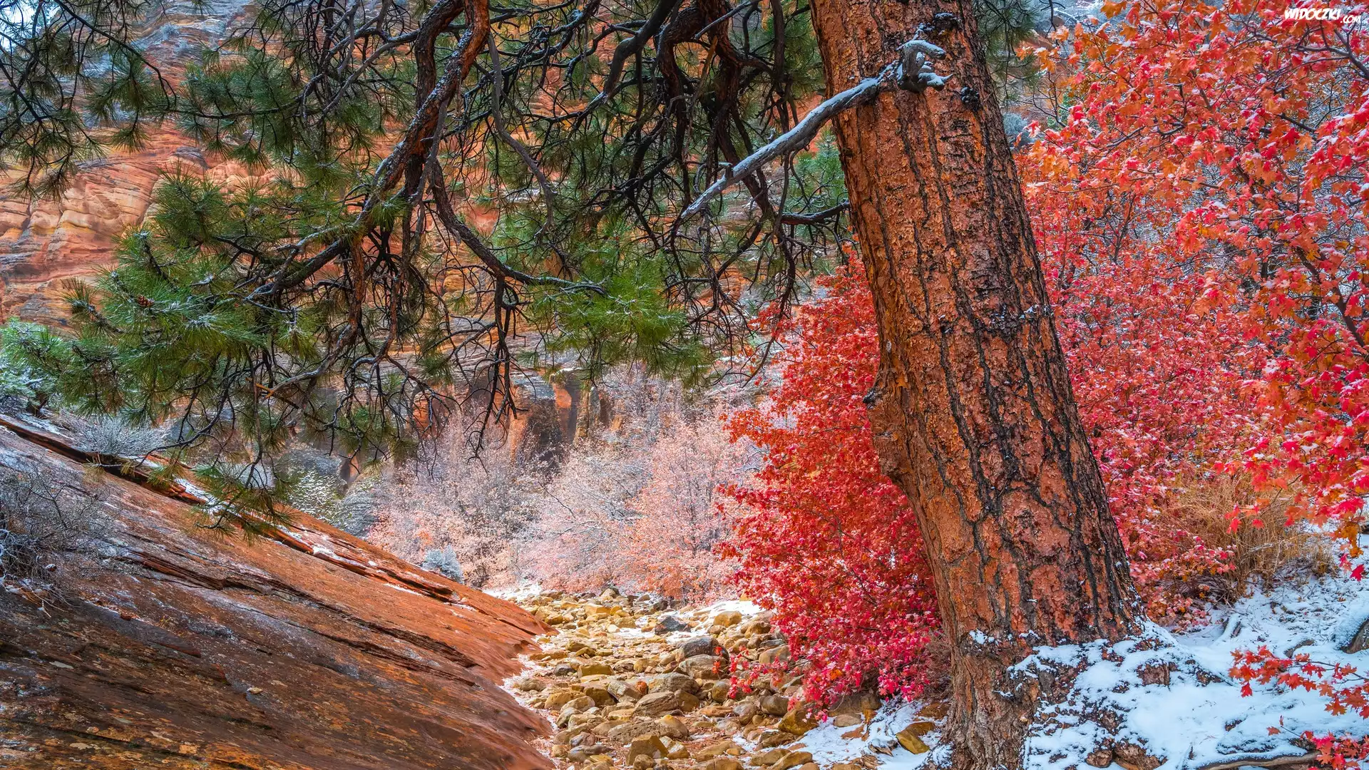 Park Narodowy Zion, Jesień, Skały, Roślinność, Drzewo, Sosna, Czerwony, Krzew, Stan Utah, Stany Zjednoczone |