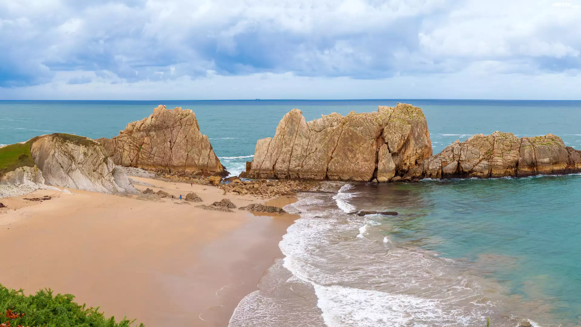 Arnia Beach, Plaża, Skały, Morze, Kantabria, Hiszpania
