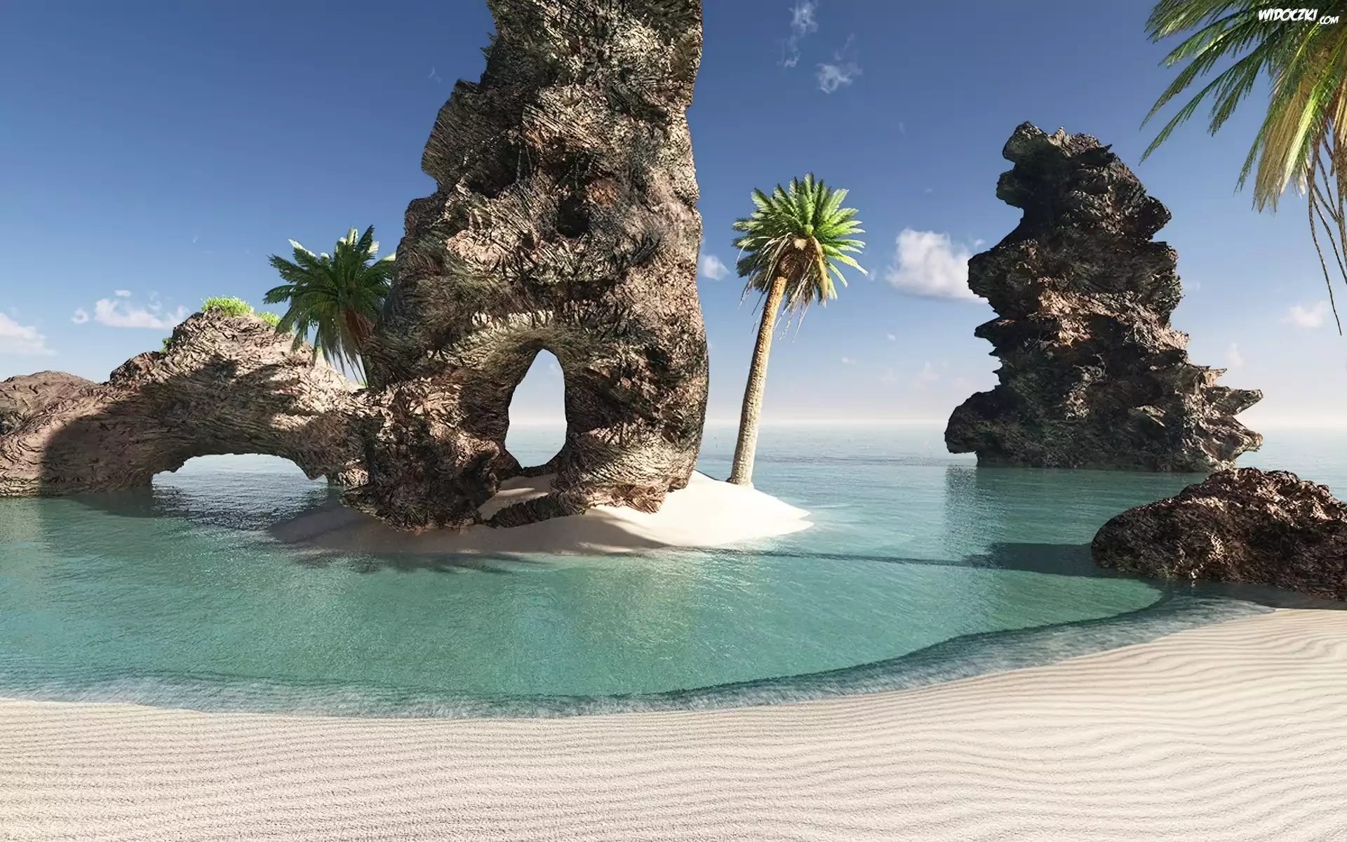 Skały, Morze, Plaża, Palmy