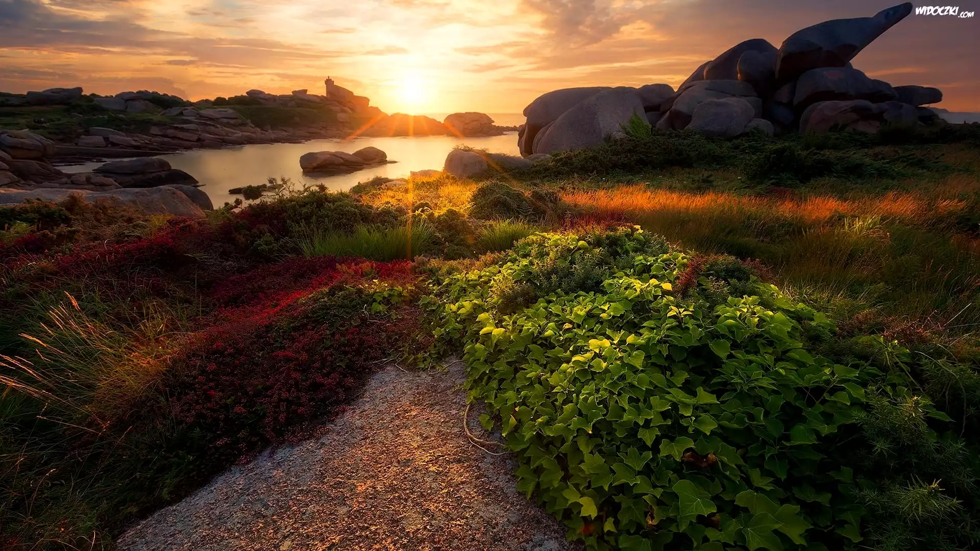 Zdjęcia, Skały, Głazy, Jezioro, Rośliny, Promienie słońca