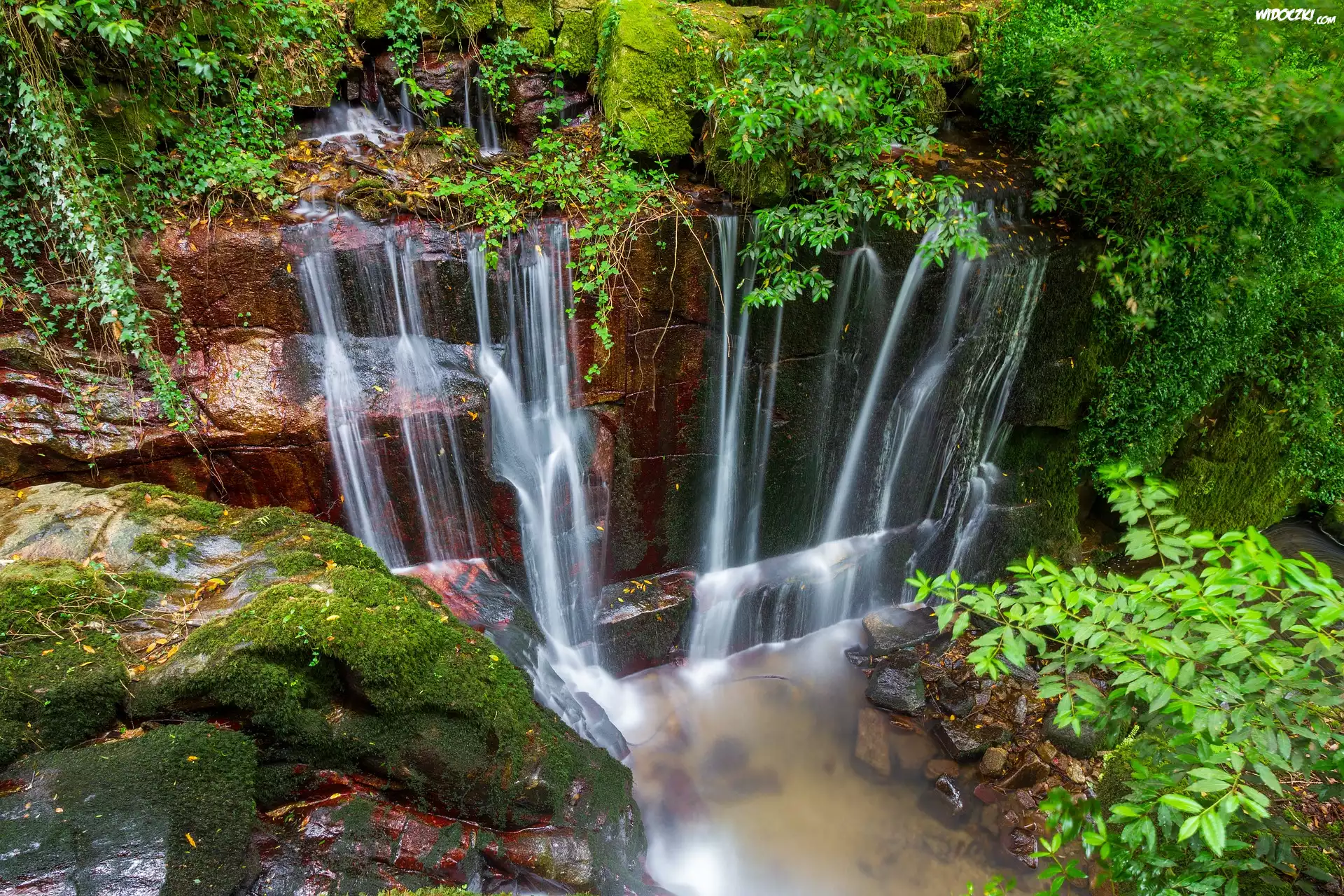 Zdjęcia, Wodospad, Skały, Roślinność, Zielone, Drzewa
