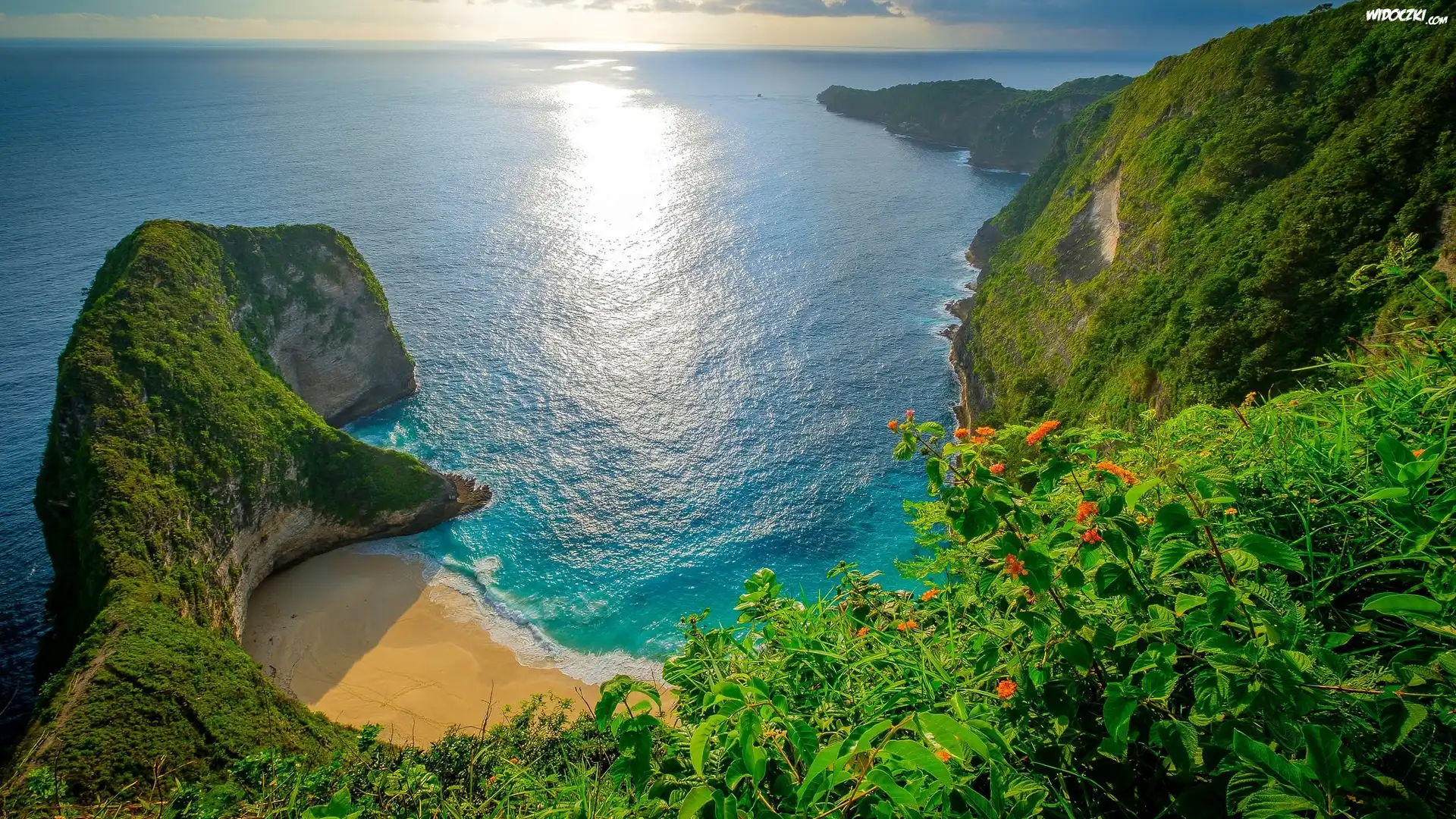 Zdjęcia, Morze, Wybrzeże, Skały, Plaża, Roślinność, Wyspa Nusa Penida, Prowincja Bali, Indonezja