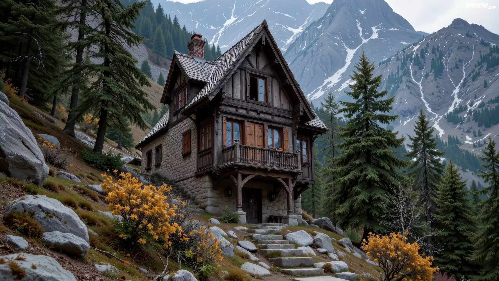 Góry, Dom, Schody, Skały, Drzewa, Grafika AI