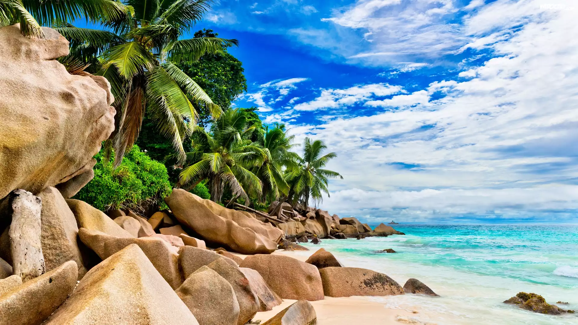 Seszele, Skały, Głazy, Palmy, Roślinność, Morze, Chmury
