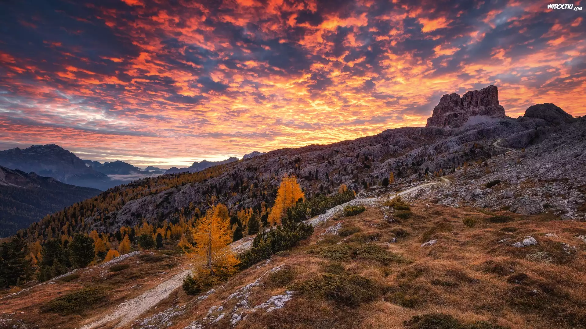 Góry, Las, Drzewa, Skały, Wschód słońca