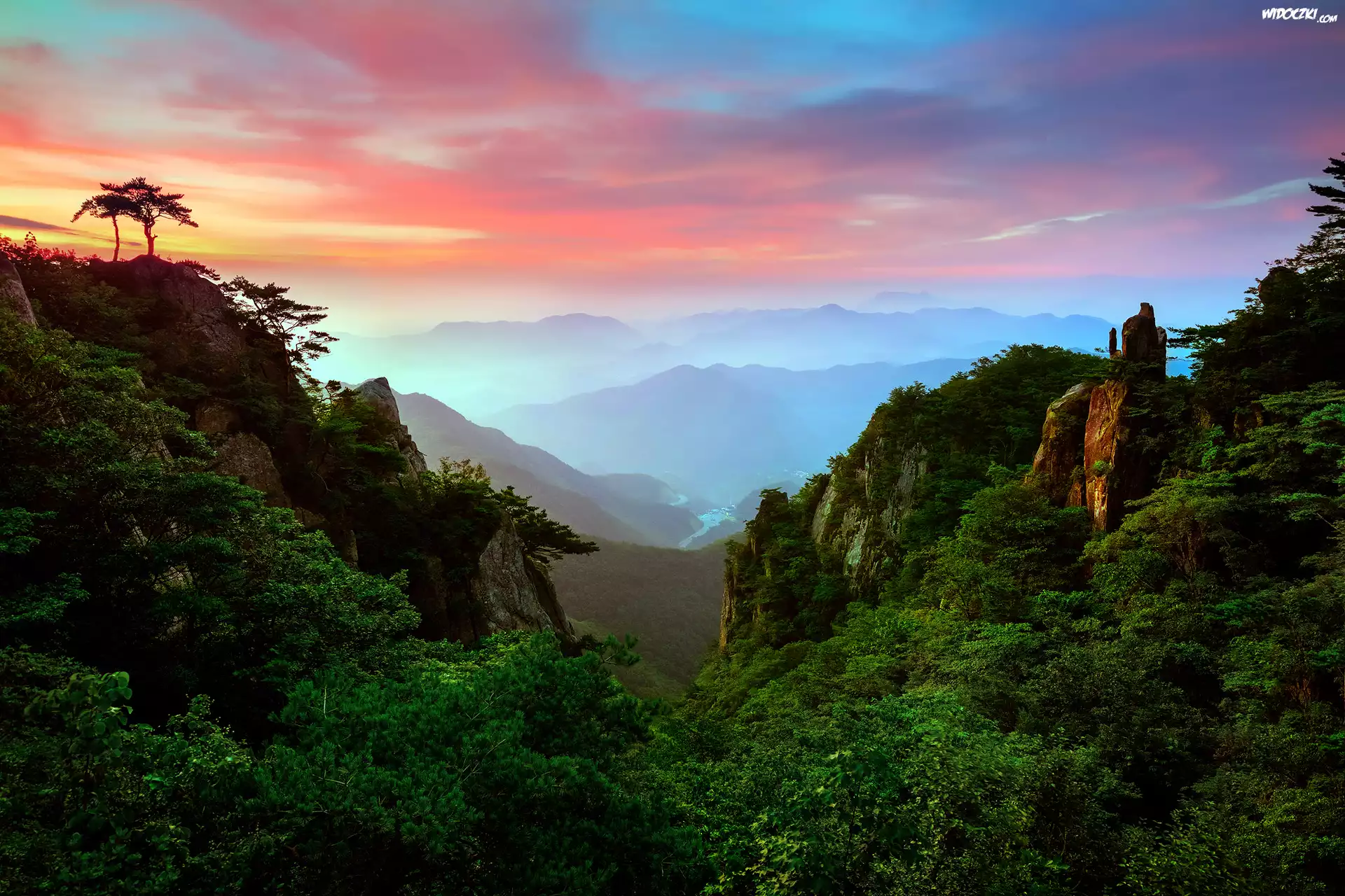 Zdjęcia, Góry, Skały, Lasy, Dolina, Mgła, Świt, Wschód, Słońca