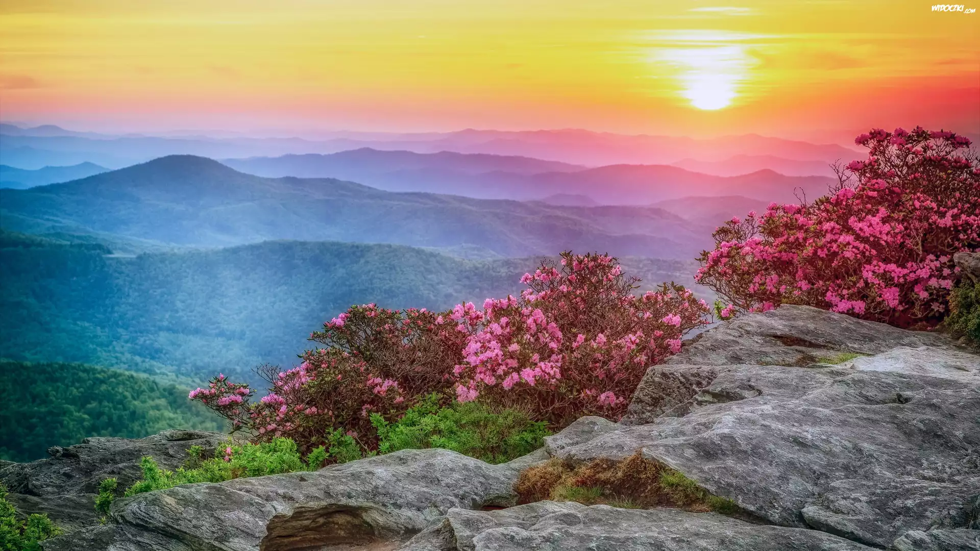 Zdjęcia, Góry, Wschód słońca, Mgła, Różowe, Kwiaty, Krzewy, Różaneczniki Skały