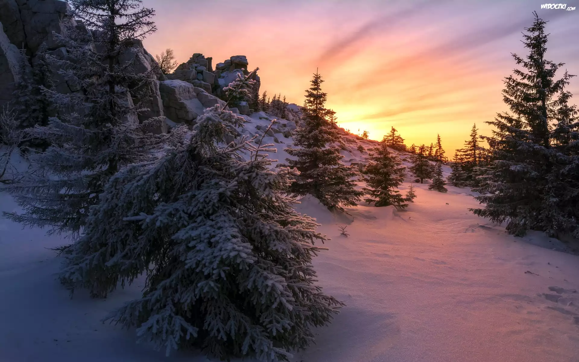 Zima, Drzewa, Skały, Zachód słońca, Park Narodowy Ziuratkul, Obwód czelabiński, Rosja