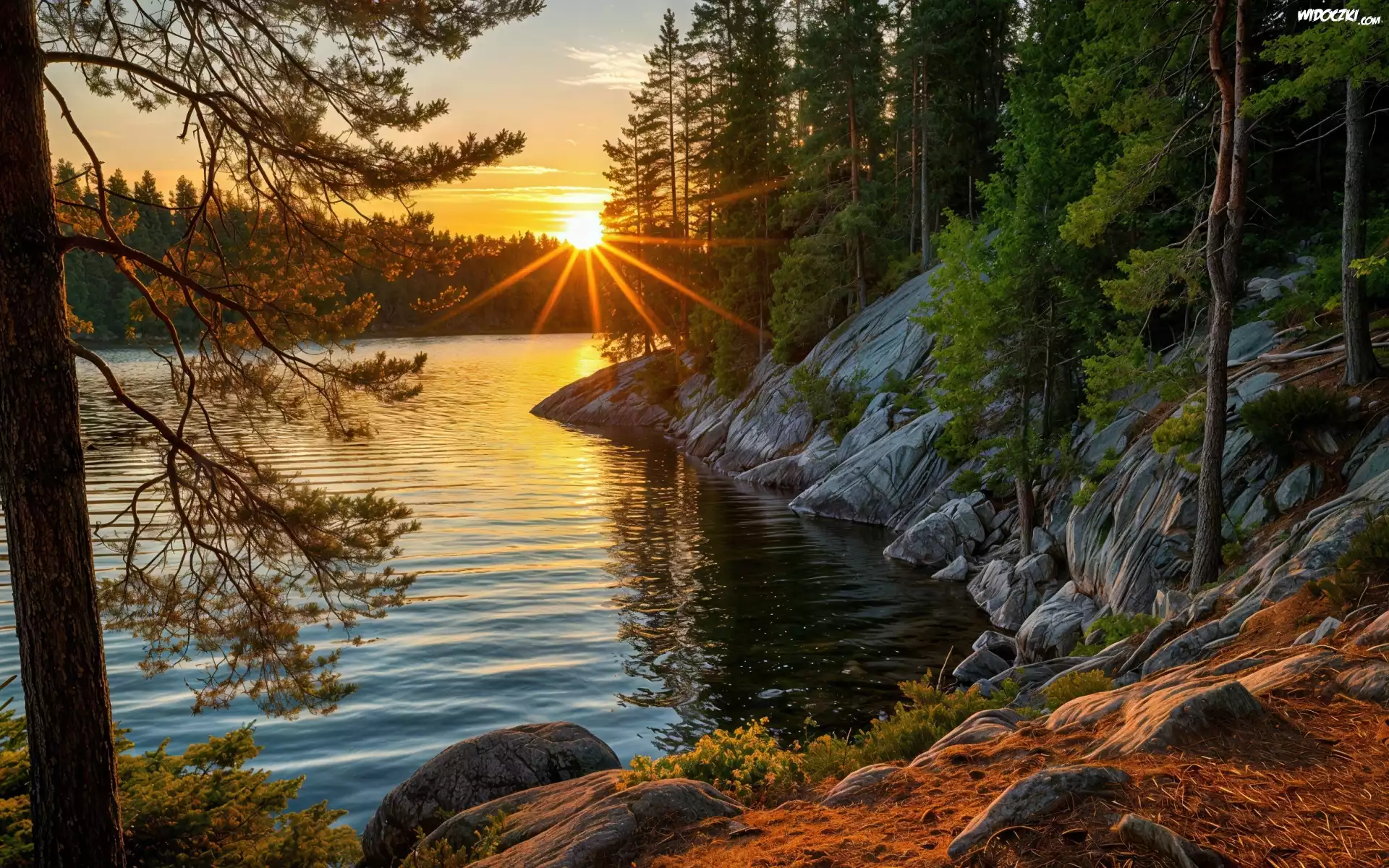 Zdjęcia, Las, Jezioro, Drzewa, Skały, Zachód słońce