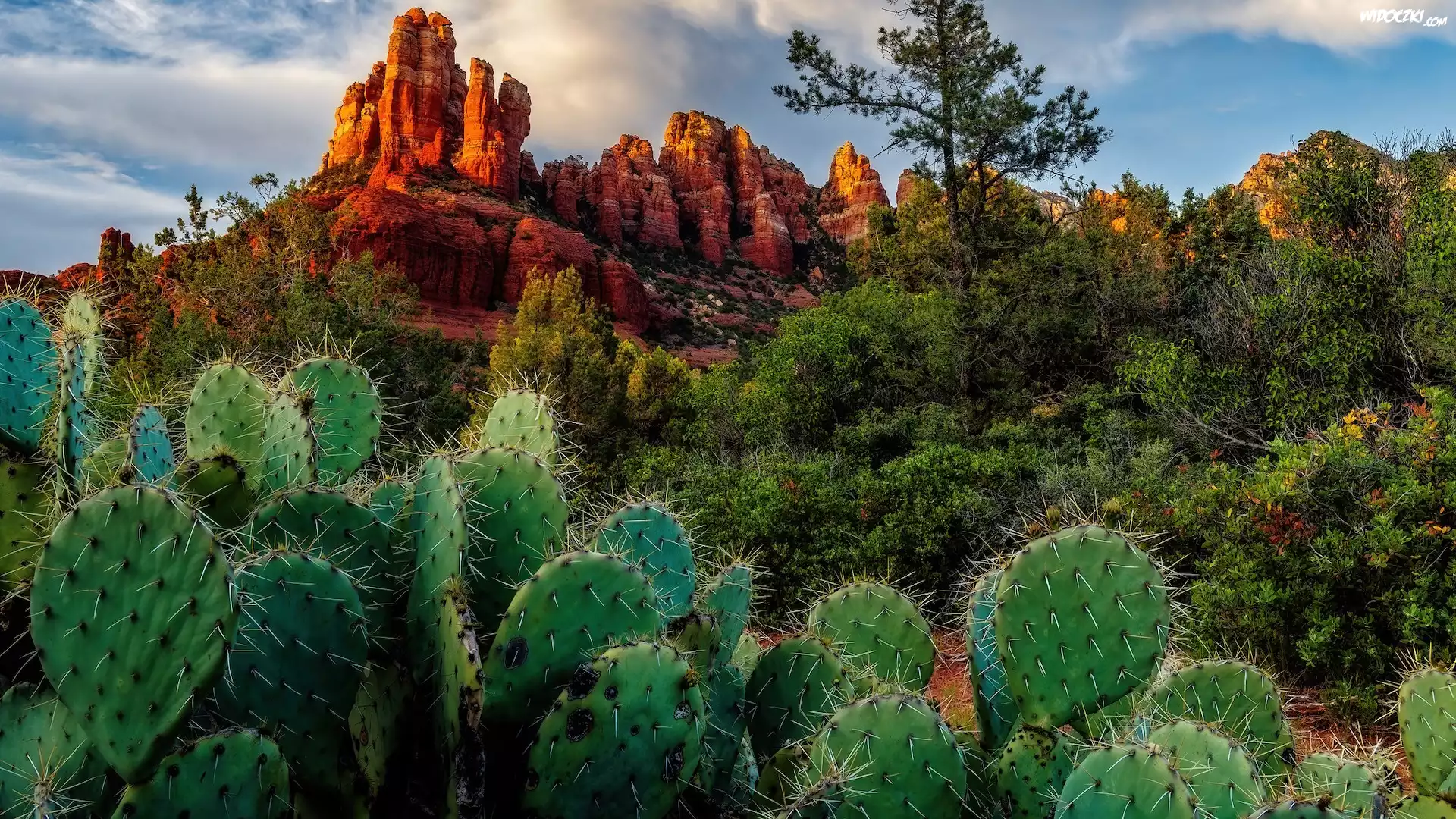 Zdjęcia, Stany Zjednoczone, Stan Arizona, Hrabstwo Coconino, Sedona, Crimsons Cliff, Skały, Drzewa, Kaktusy
