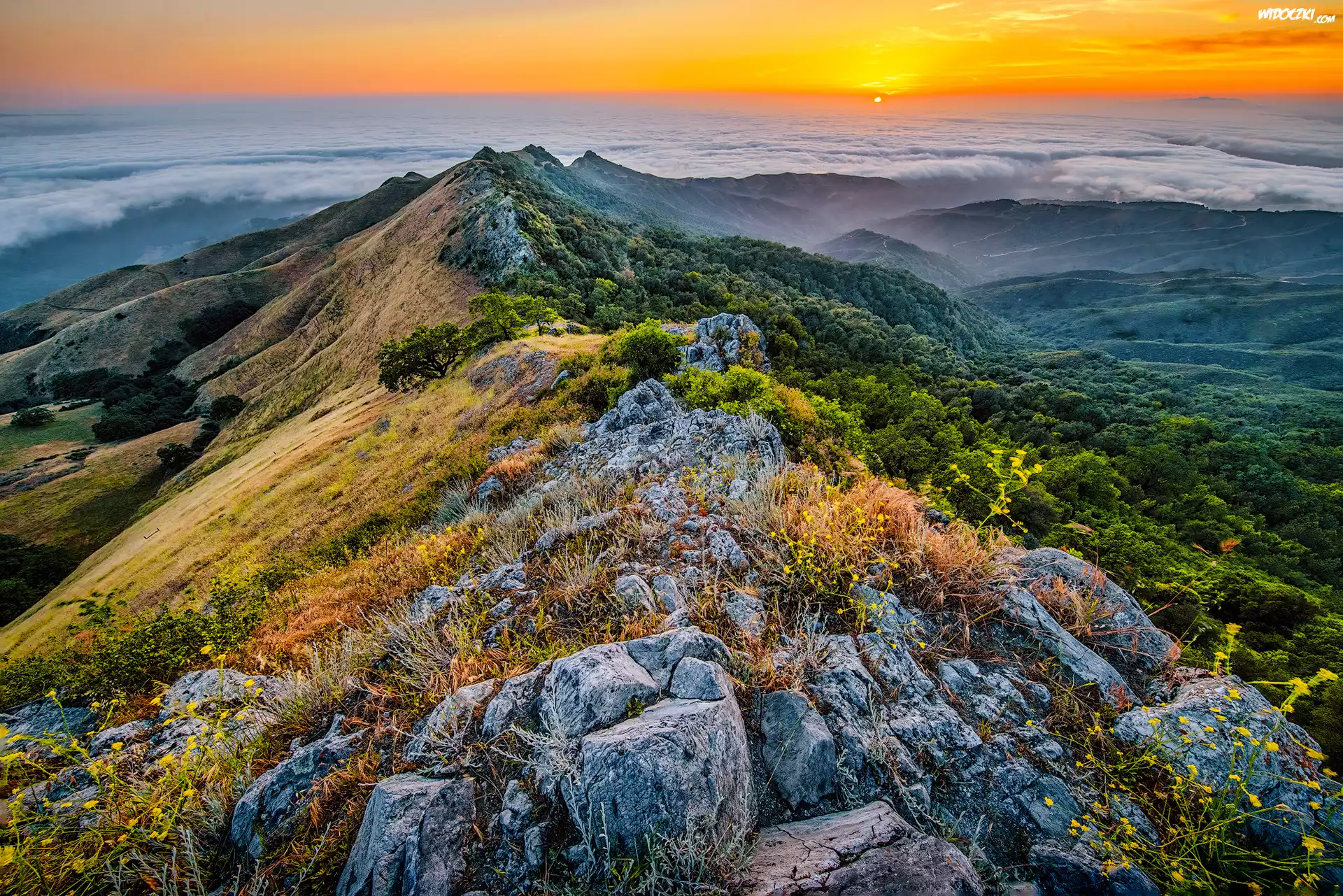 Stany Zjednoczone, Kalifornia, Park Stanowy Fremont Peak, Góry, Skały, Lasy, Roślinność, Mgła, Zachód słońca |
