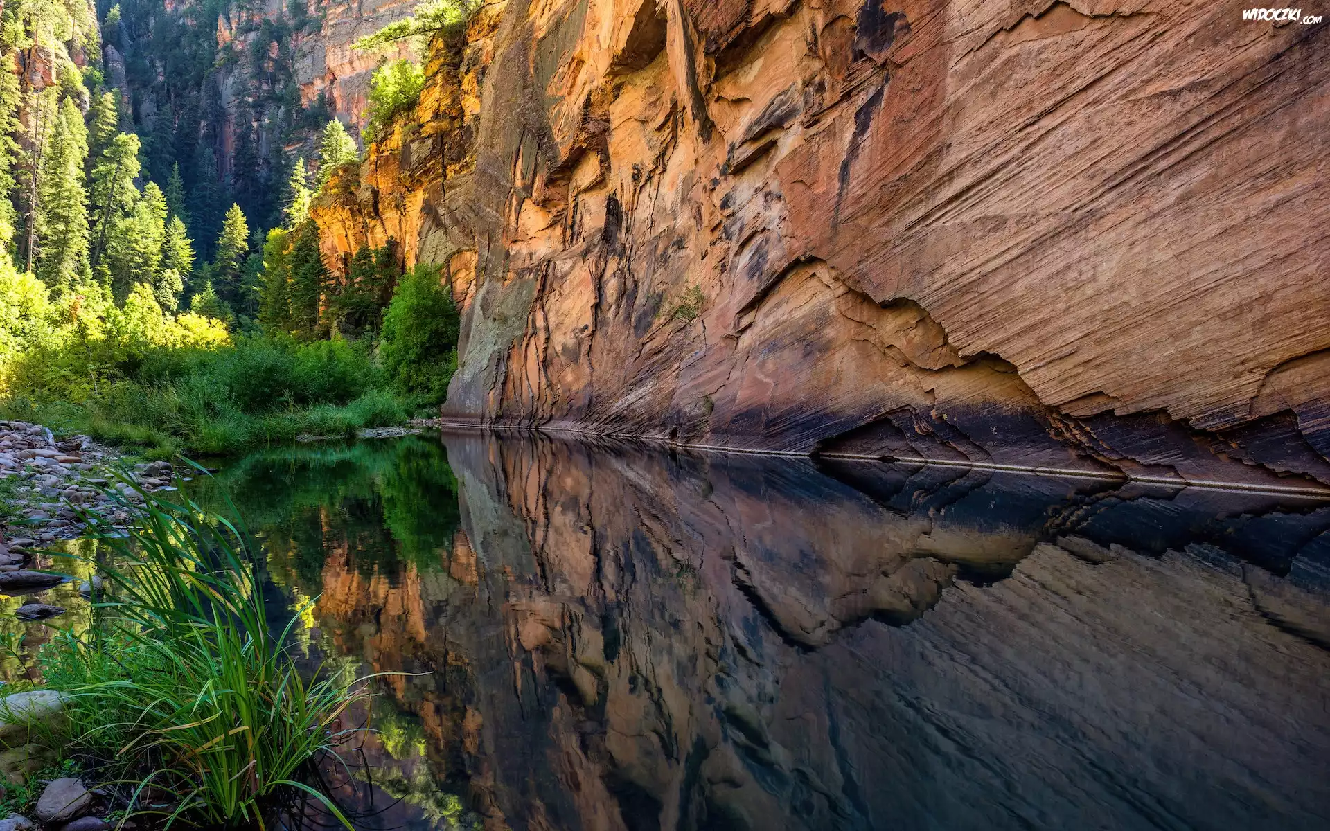Zdjęcia, Skały, Rzeka, West Clear Creek, Krzewy, Odbicie, Arizona, Stany Zjednoczone