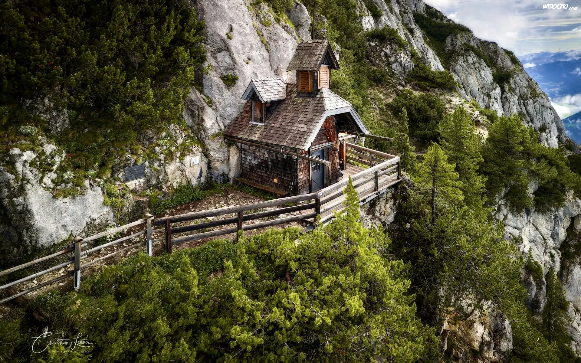 Austria, Góry, Stoderzinken, Skały, Kapliczka, Ogrodzenie, Drzewa