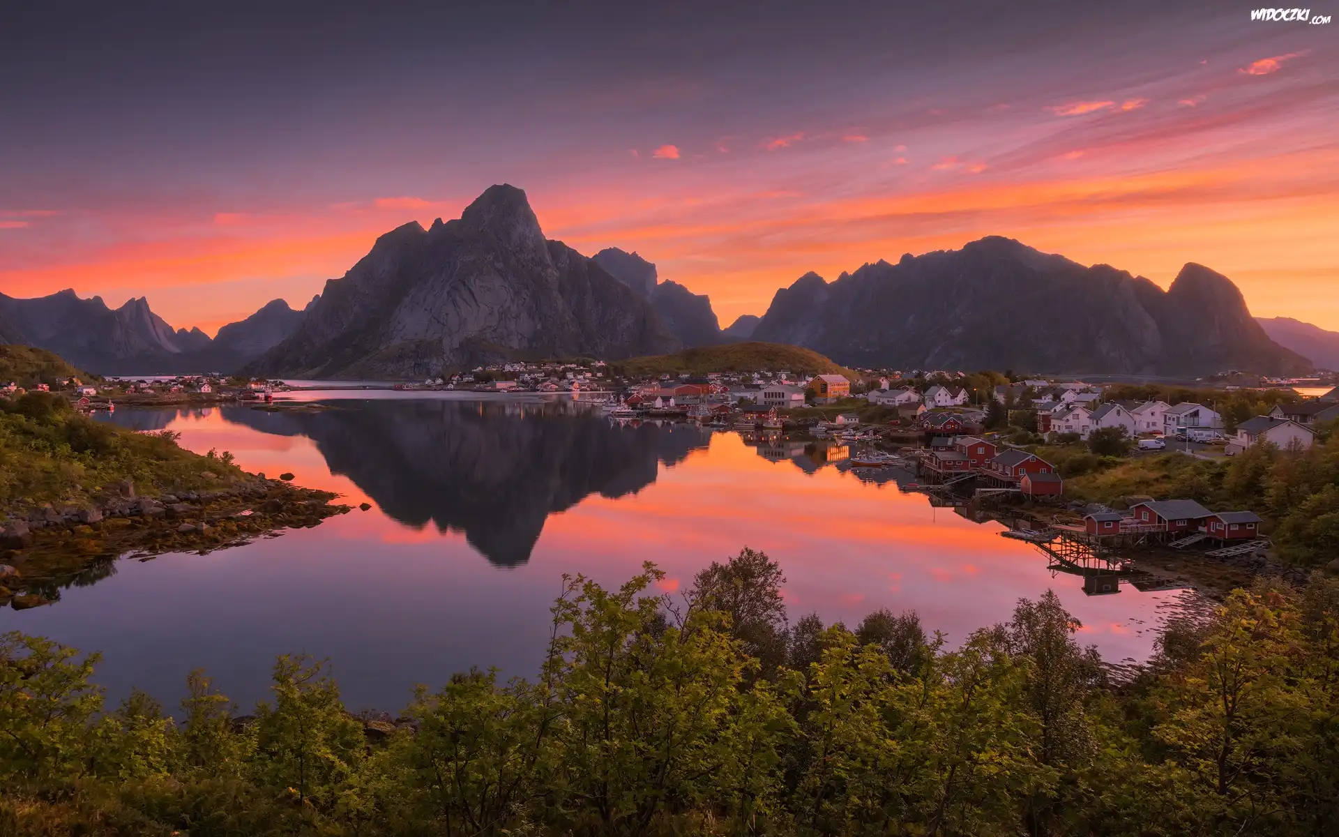 Norwegia, Lofoty, Wyspa Moskenesoya, Wioska Reine, Morze Norweskie Skały, Domy, Góry, Drzewa, Zachód słońca |