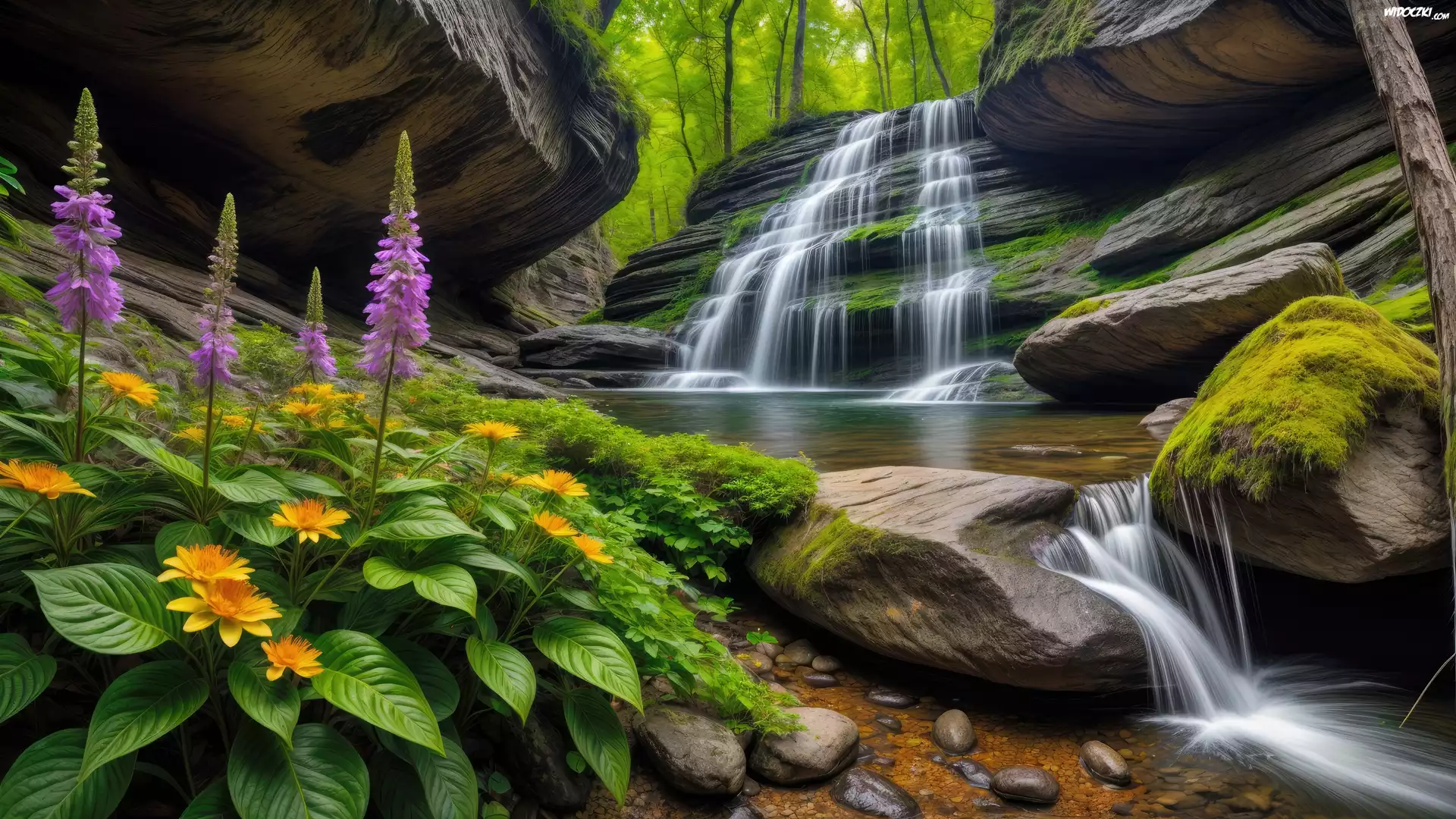 Las, Skały, Wodospad, Kwiaty, Grafika