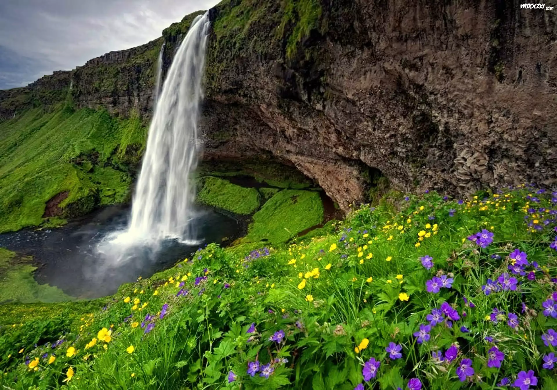 Zdjęcia, Wodospad, Skały, Kwiatki