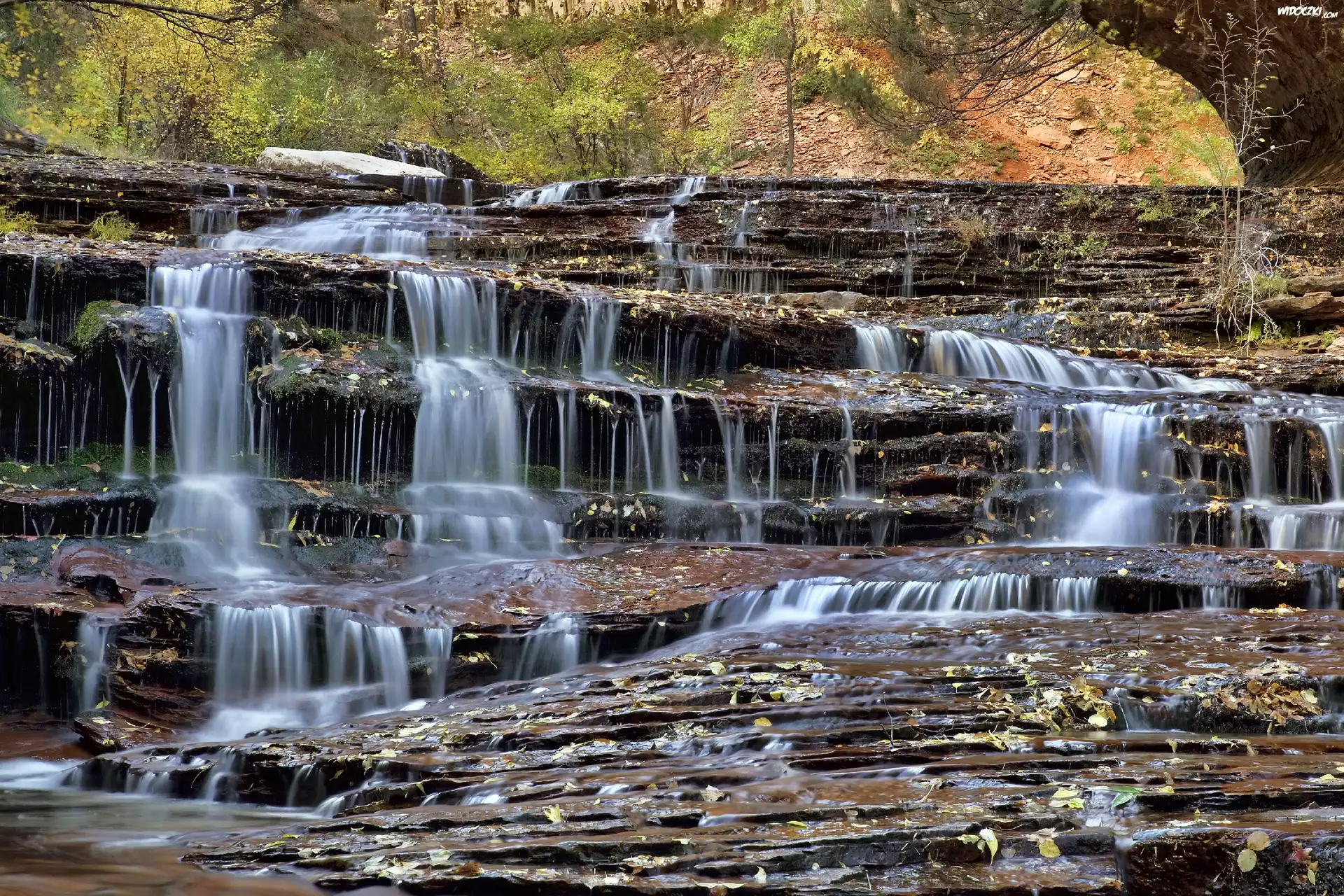 Zdjęcia, Wodospad, Skały, Liście