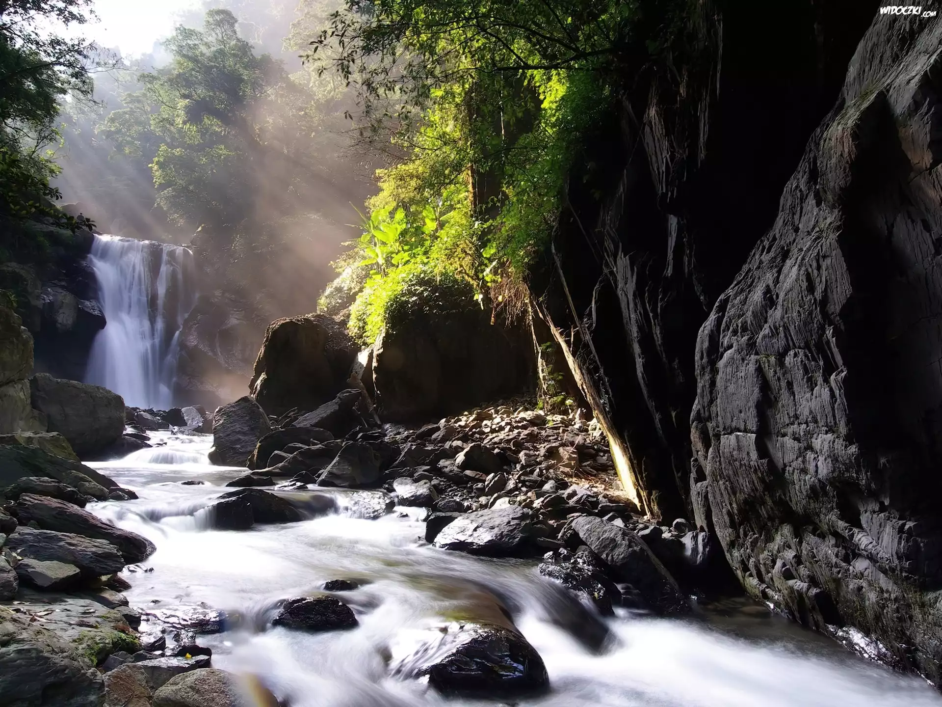 Zdjęcia, Skały, Rzeczka, Wodospad, Drzewa