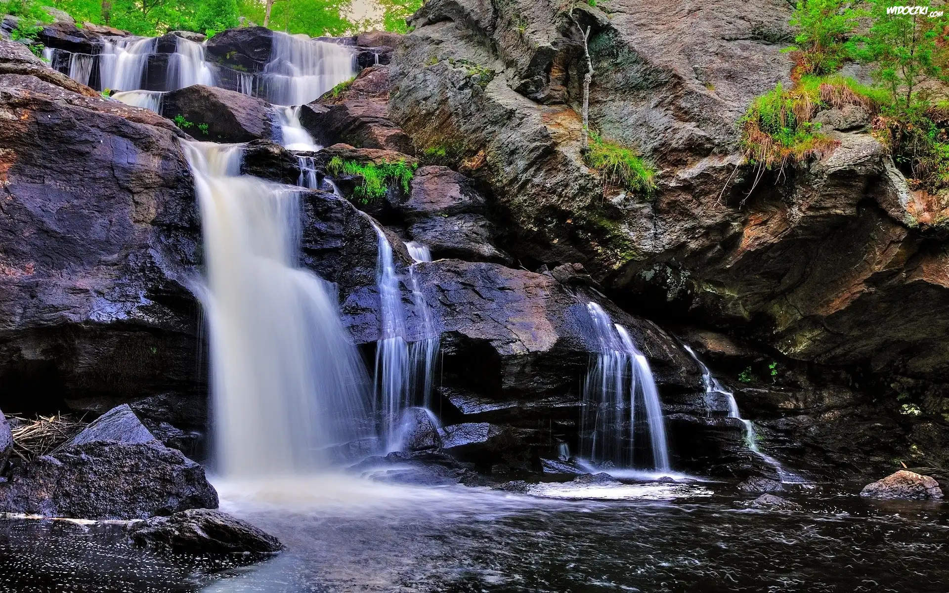 Góra, Skały Wodospad Wodospad, skały Wodospad, skały Zachód Słońca, Skała, Morze Góra, Wodospady, Paprocie Skała, Plaża Skała Morze, Skała Morze, Skała Wodospad Drzewa Kajakarstwo, Wodospad Skaliste, Góry, Planeta Wodospad