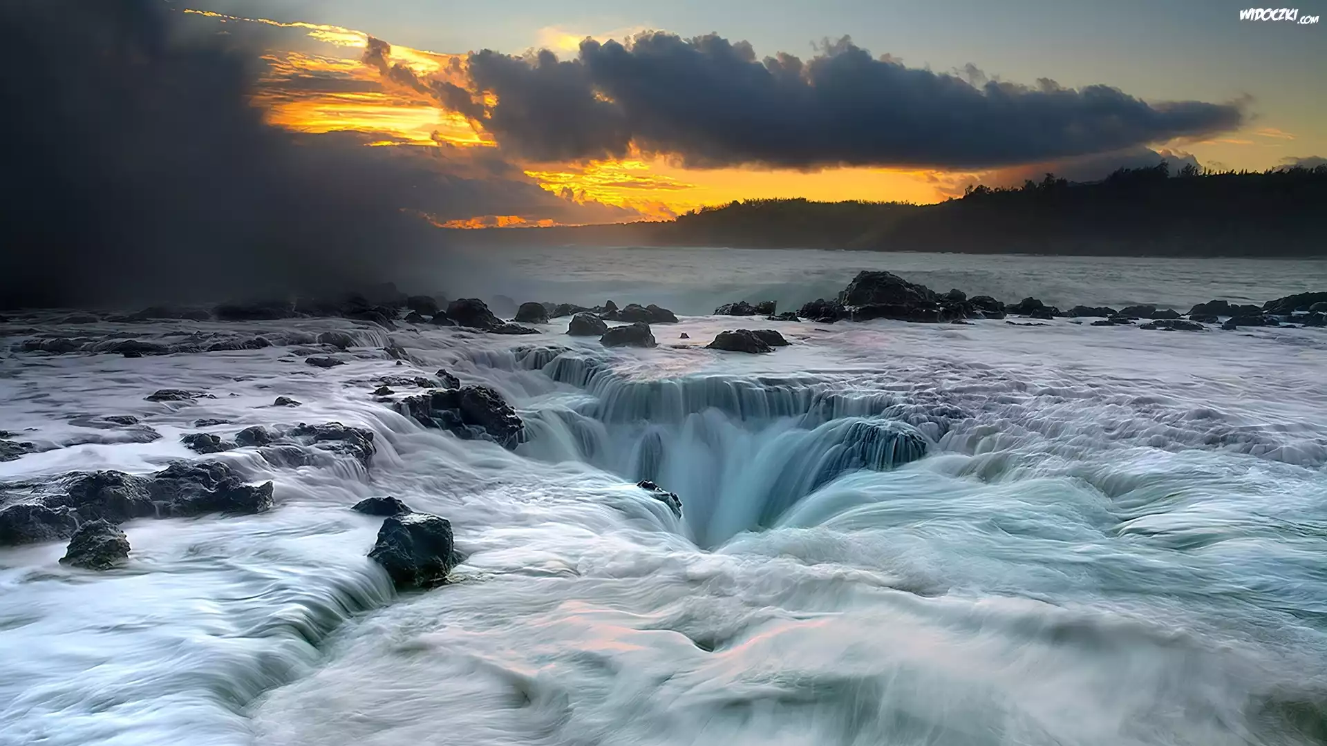 Zdjęcia, Skały, Zachód, Słońca, Wodospady, Woda