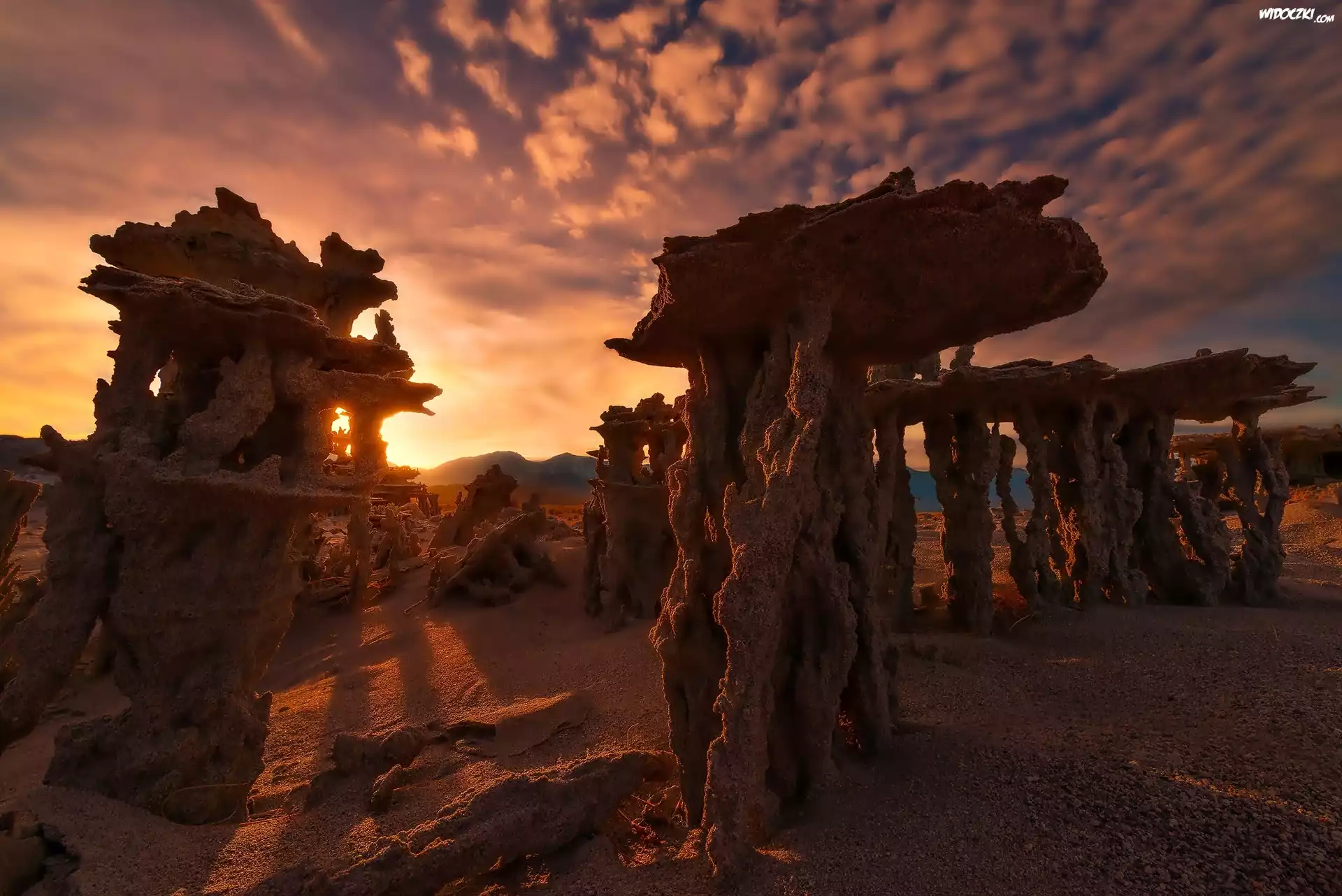 Zdjęcia, Wulkaniczne, Skały, Tufowe, Zachód, Słońca, Chmury, Kalifornia