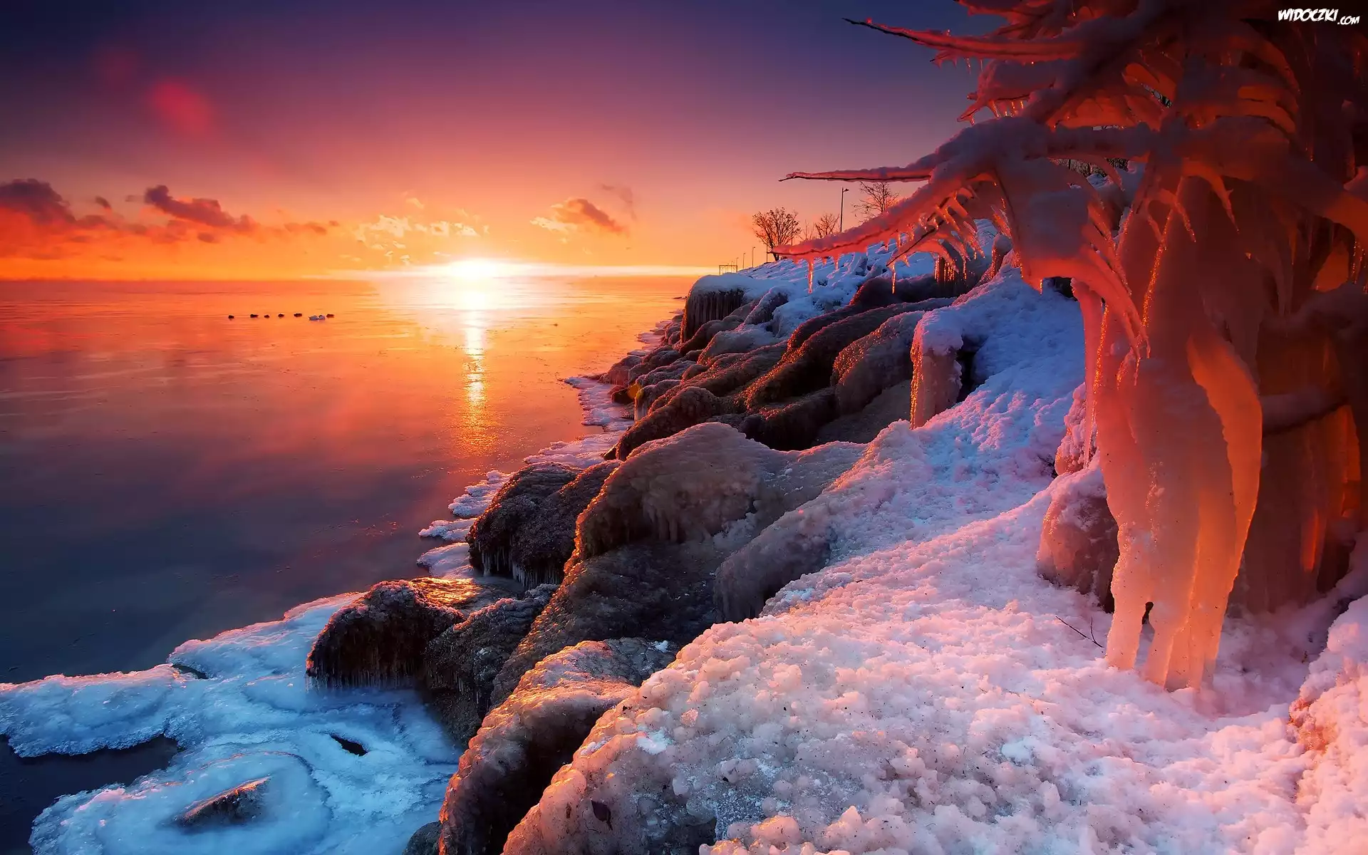 Zdjęcia, Wybrzeże, Skały, Lodowe, Sople, Wschód, Słońca, Zima
