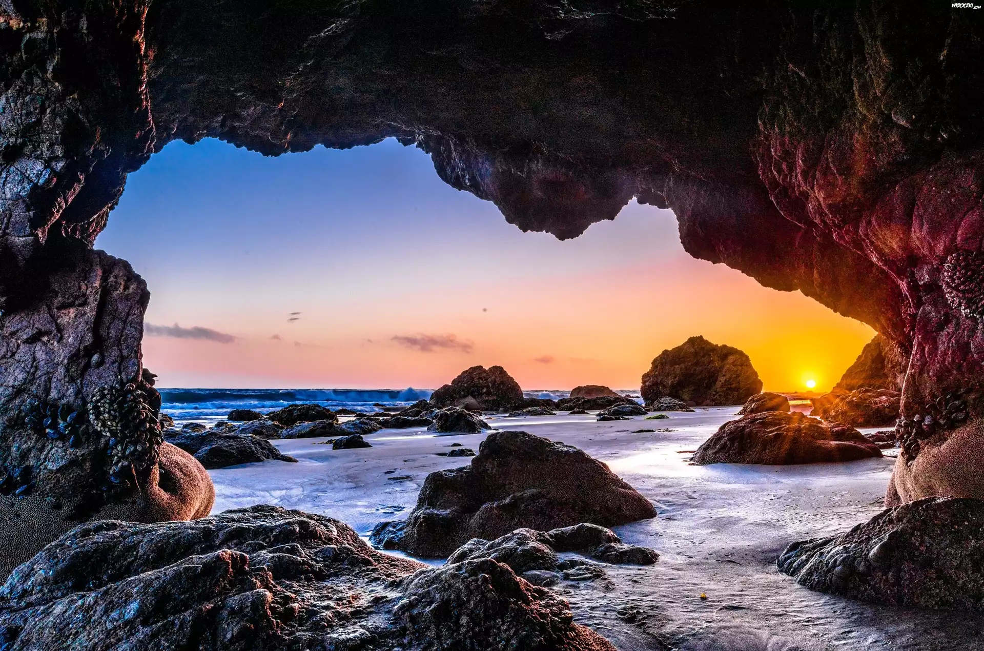Zdjęcia, Skały , Jaskinia, Morze, Kamienie, Zachód, Słońca