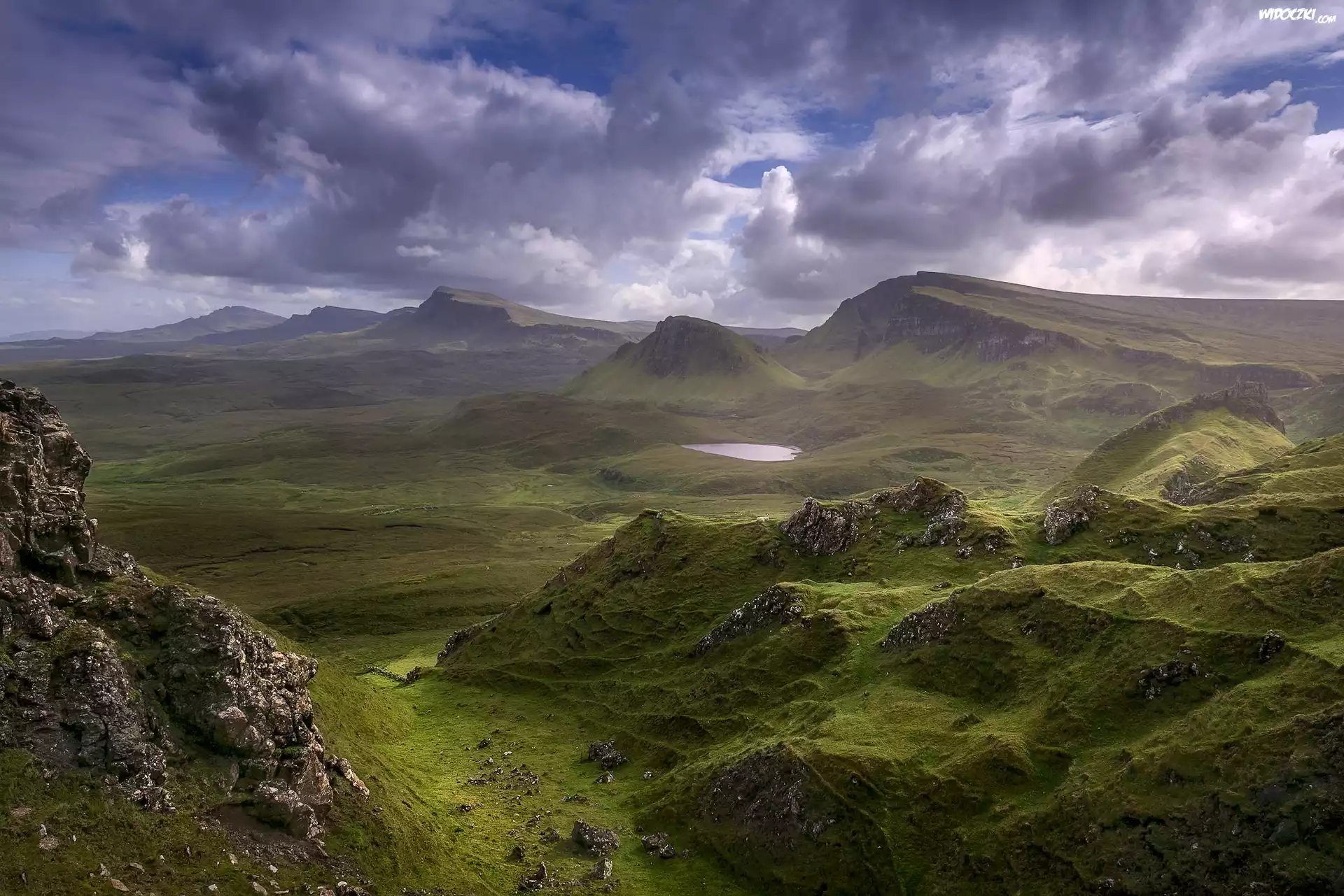 Zdjęcia, Wyspa Skye, Szkocja, Góry, Jezioro, Kamienie, Skały, Roślinność
