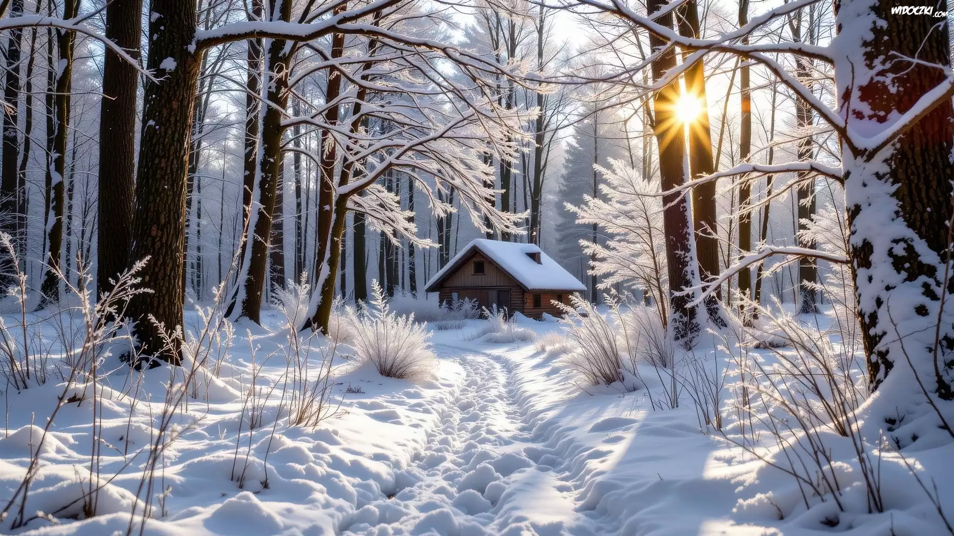 Zdjęcia, Zima, Las, Dom, Ośnieżone, Drzewa, Krzewy, Droga, Ślady
