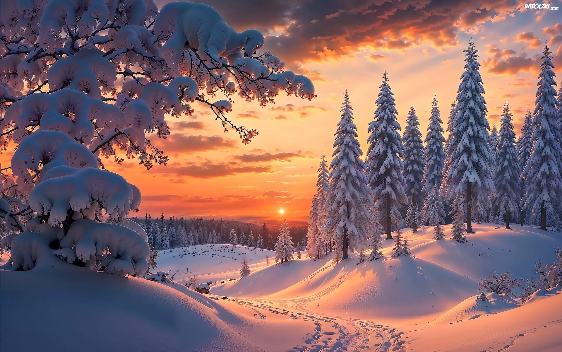 Zdjęcia, Zima, Ośnieżone, Drzewa, Ślady, Zachód słońca